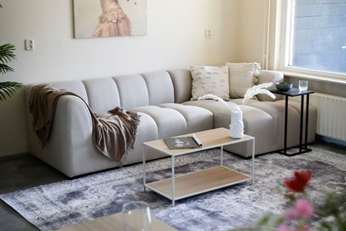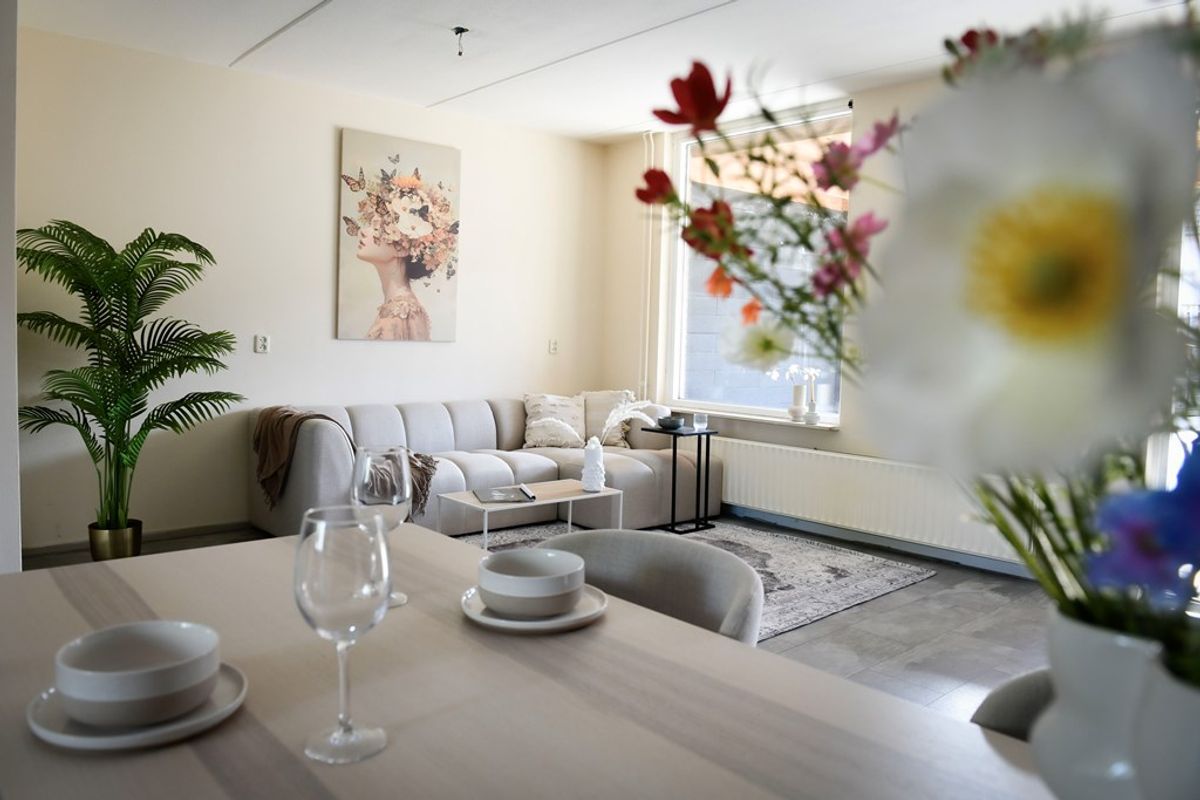 Woonkamer 5,15 x 5,15/4,15 met laminaatvloer, berging onder trap, deur naar achtertuin en open keuken.