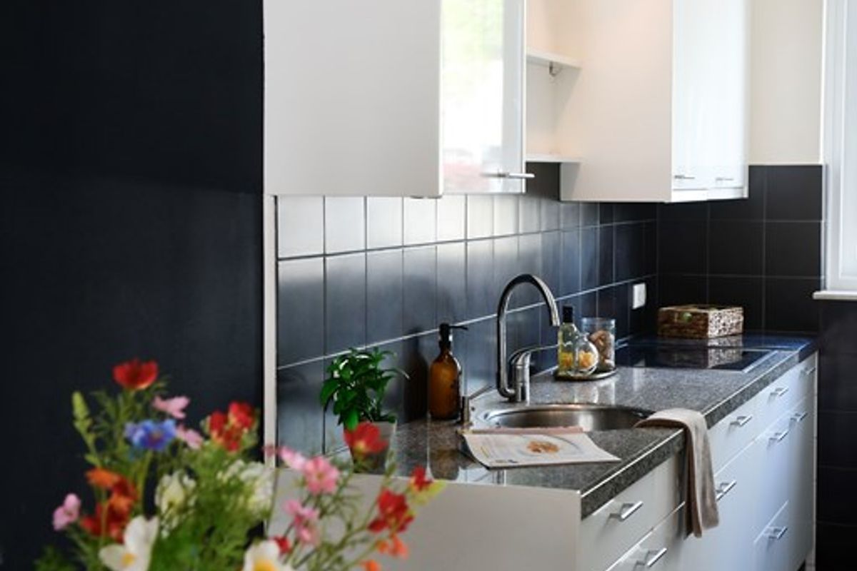 Keuken 3,05 x 2,30 met plavuizenvloer, hoogglans aanbouwkeuken met elektrische kookplaat met afzuigunit en spoelbak.