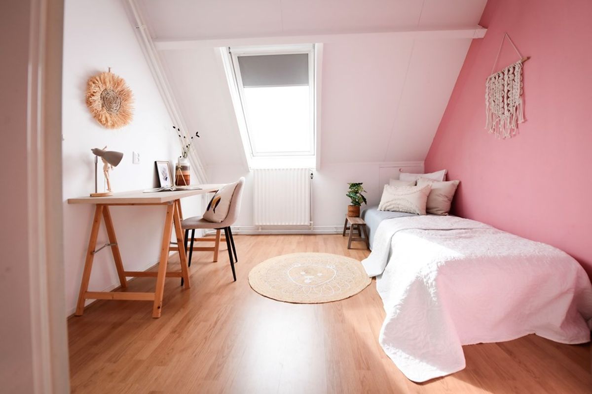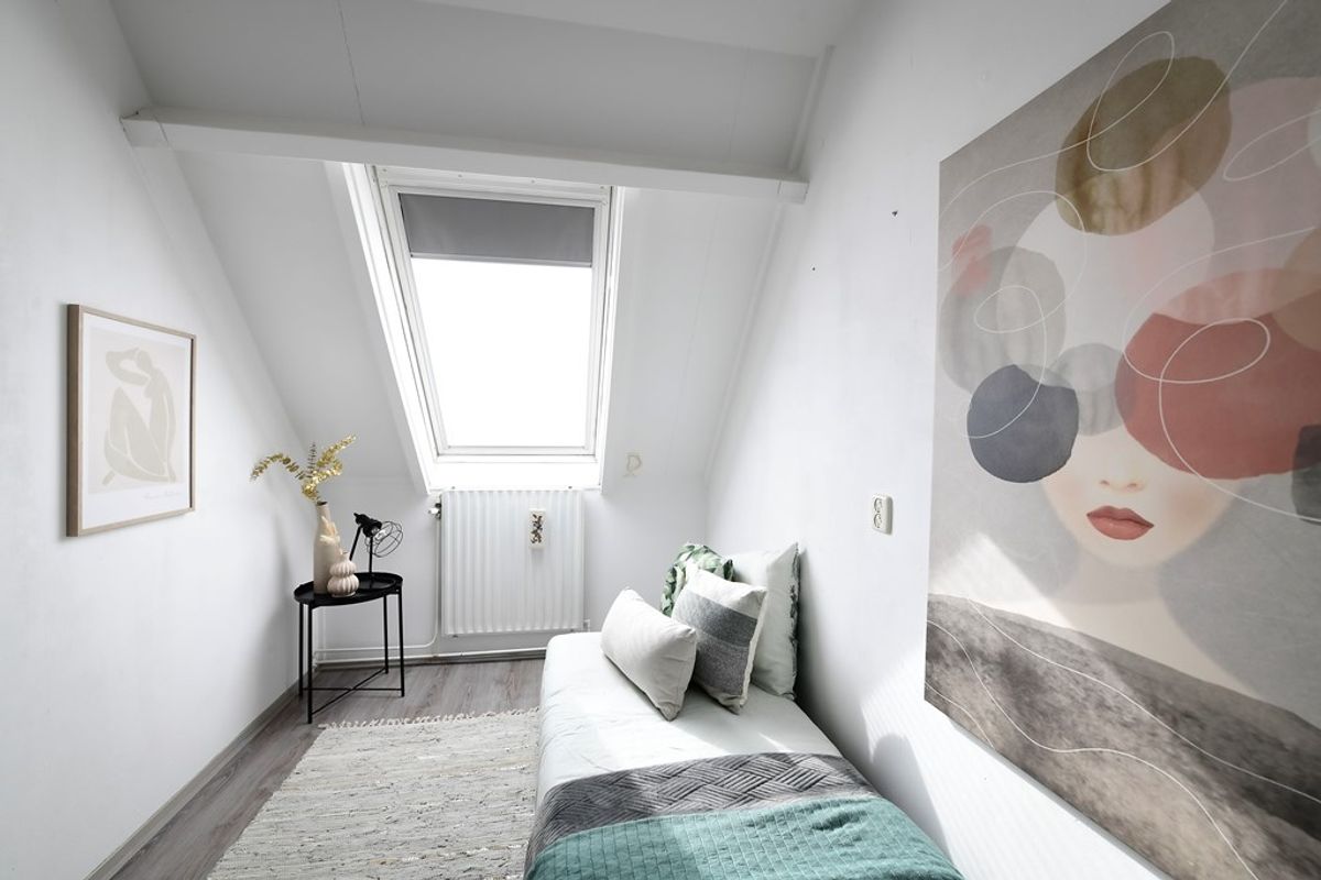 Slaapkamer 2: 3,05 x 2,10 met laminaatvloer en dakraam met zonwering.