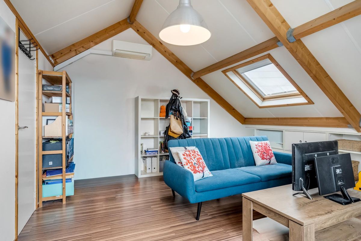 De zolder is een veelzijdige ruimte met zichtbare houten balken en veel daglicht dankzij het dakkapel. Perfect als extra slaapkamer, werkkamer of hobbyruimte. De strakke afwerking en de opbergruimte achter de knieschotten maken het helemaal af.