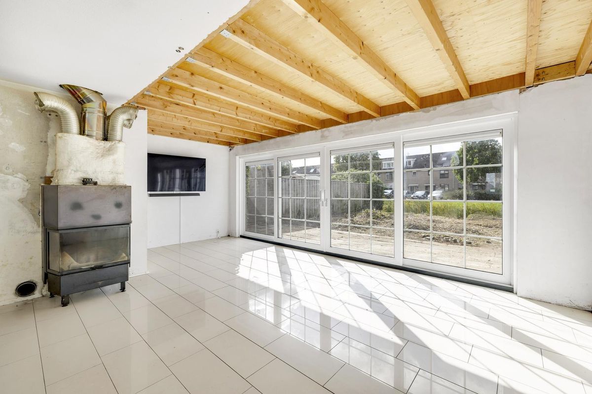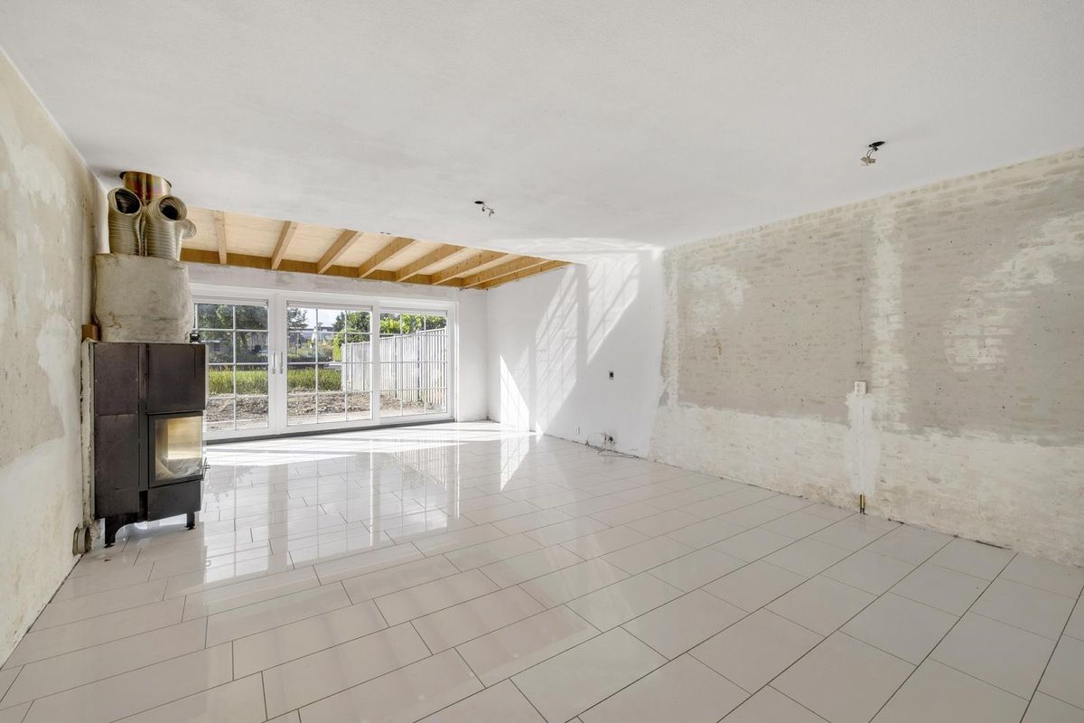 Lichte woonkamer met grote uitbouw en schuifpui naar de tuin. De woonkamer is v.v. plavuizen met vloerverwarming en houtkachel.