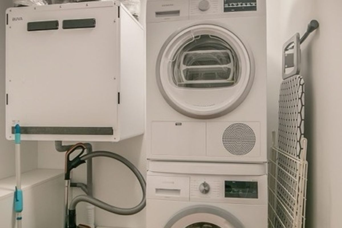 Daarnaast is er een aparte bijkeuken met wasmachine en droger. Het appartement beschikt over een hoogwaardige kurkvloer met vloerverwarming, moderne verlichting zoals te zien op de foto’s, en in de slaapkamer zijn duo rolgordijnen (verduisterend + lichtdoorlatend) aanwezig. Alle ruimtes zijn voorzien van blinds, rolgordijnen, gordijnrails en gordijnen.