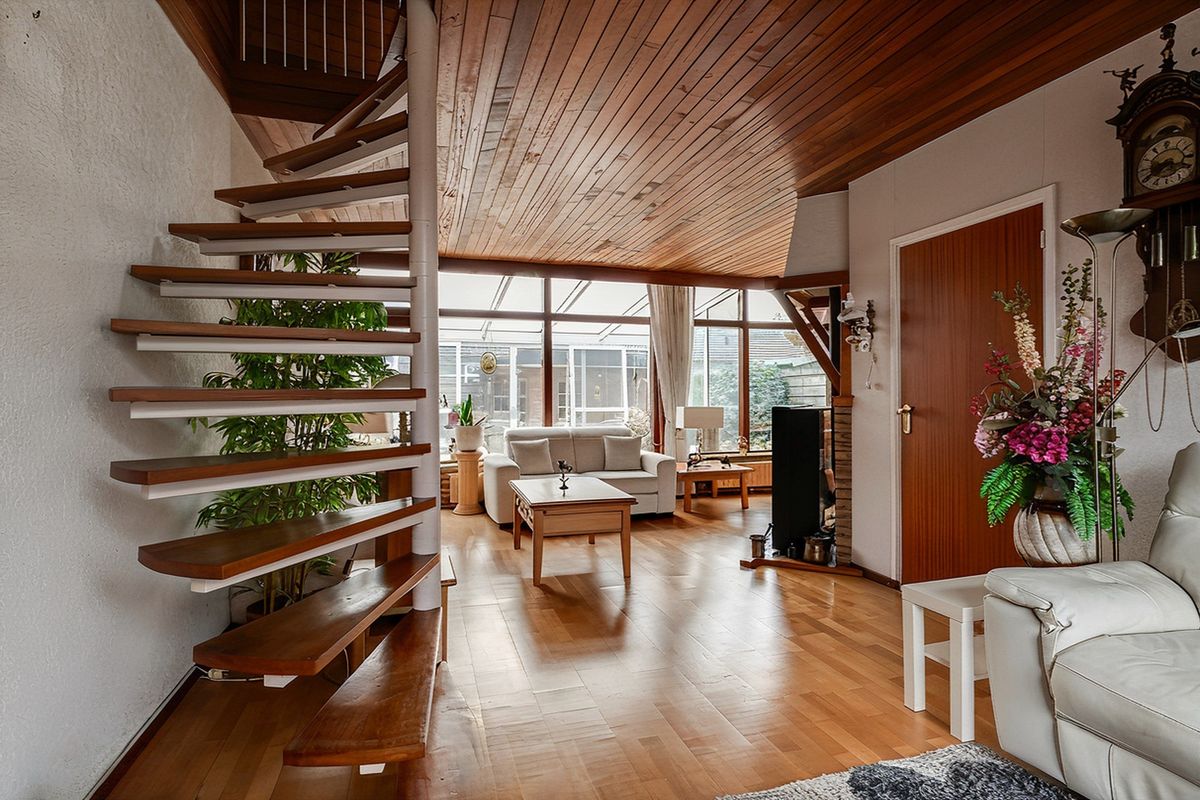 Een stalen wenteltrap met houten treden brengt je vanuit de living naar de verdieping.