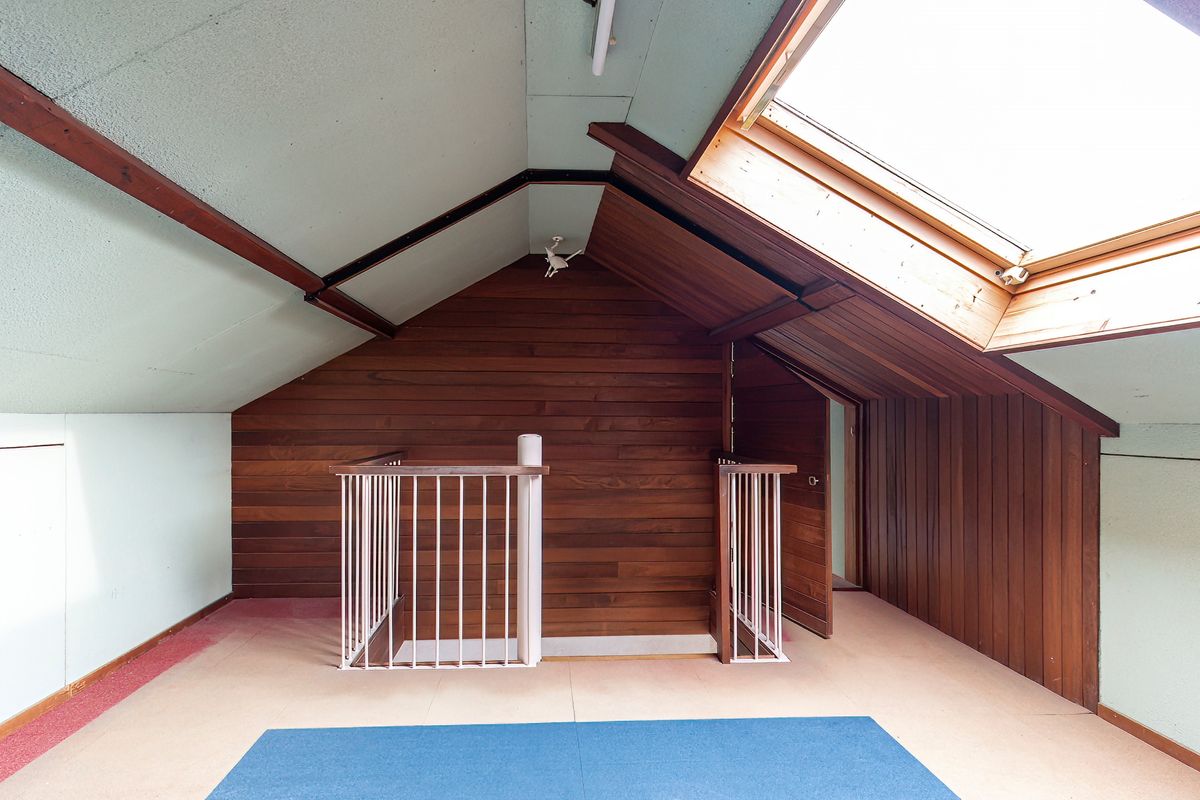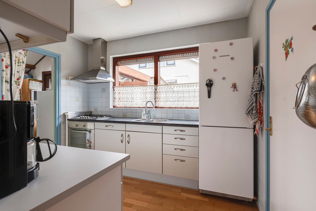 Aangrenzend ligt de bijkeuken met de “Intergas HRE” combiketel, meterkast, omvormer van de zonnepanelen, wasmachine-/drogeraansluiting en een kastruimte. Het Velux-venster in het dakvlak zorgt hier voor daglicht en ventilatie.
