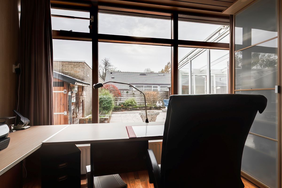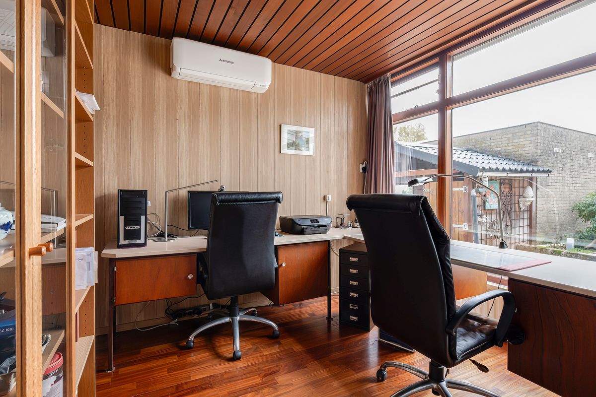 Terug in de ontvangsthal bereiken we de ruime kantoor-/werkkamer aan de tuinzijde. Vanzelfsprekend is deze ruimte ook uitstekend geschikt als slaapkamer. De garderobekast en de boekenkasten zijn inclusief. De brede glaspui biedt maximaal zicht op de tuin, waarbij de elektrische screen zorgt dat je het zonlicht kunt doseren. De airconditioner is in 2023 geïnstalleerd en zorgt voor een aangenaam klimaat.
