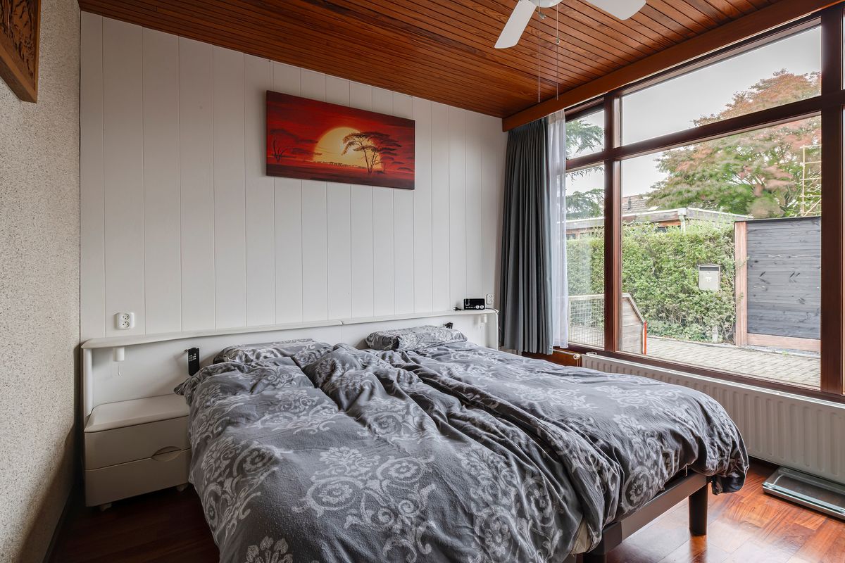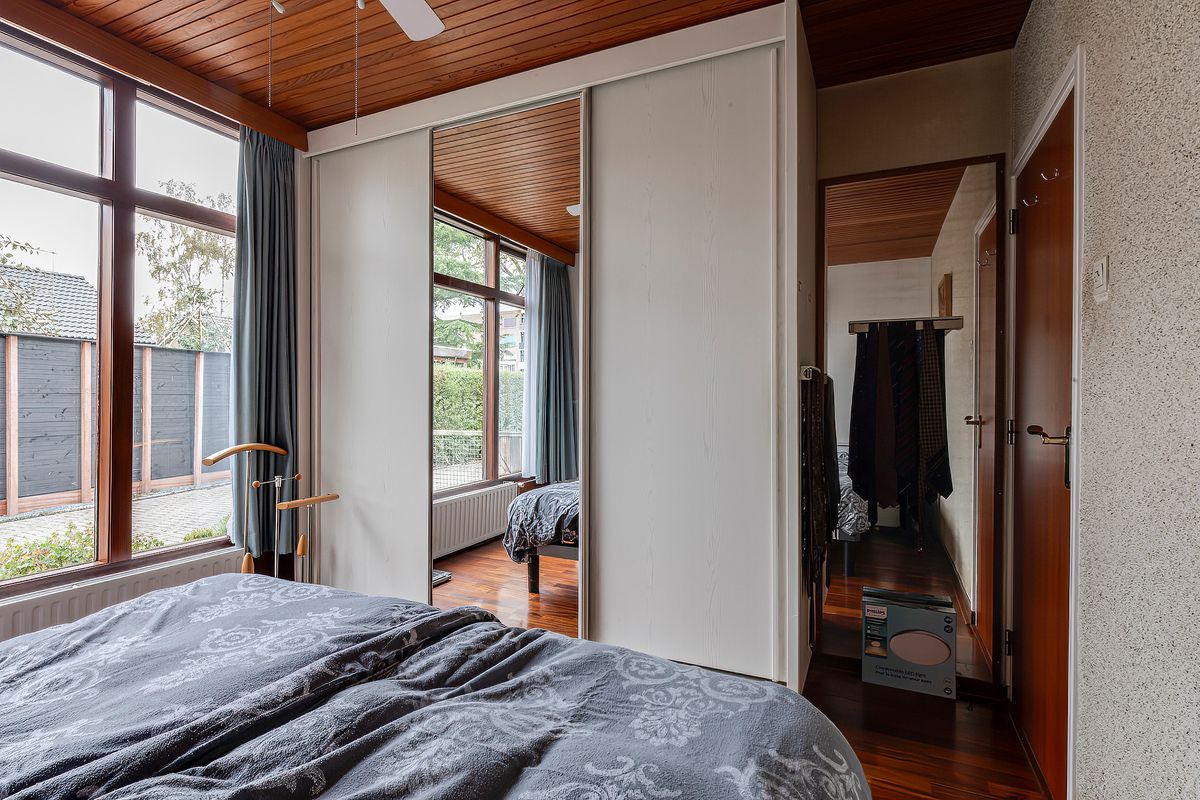 De ruime slaapkamer is gelegen aan de voorzijde van het huis en beschikt over een royale schuifkastenwand met hang- en leggedeelten; ideaal voor een georganiseerde garderobe.