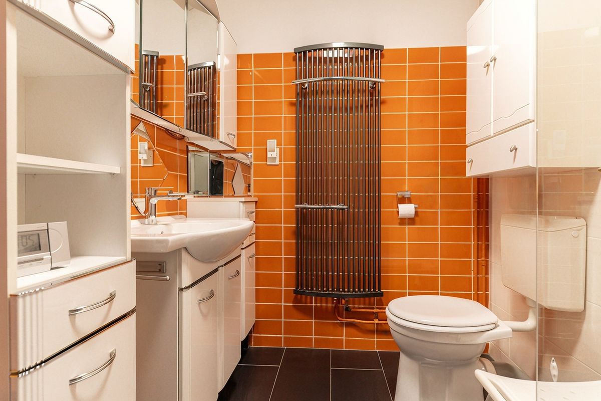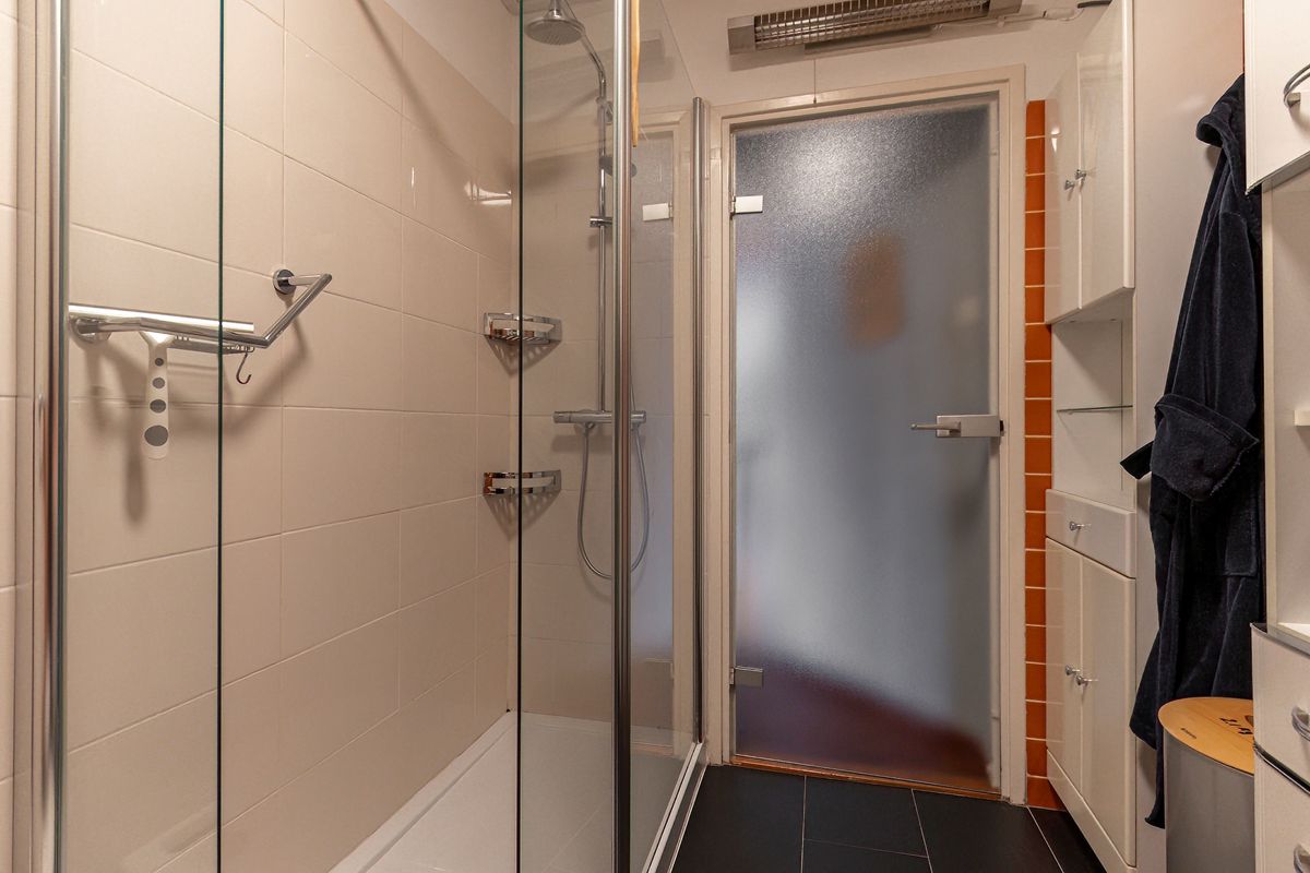 De badkamer is compleet en comfortabel ingericht. Je doucht er heerlijk in de ruime douche met glazen wanden, regendouche en handdouche. Het moderne wastafelmeubel met spiegel en verlichting biedt volop gebruiksgemak, terwijl het toilet het sanitair compleet maakt. Ook aan opbergruimte is gedacht, en de designradiator zorgt tenslotte voor de verwarming.