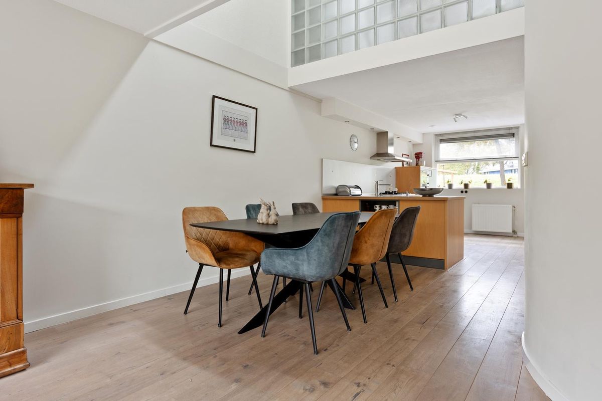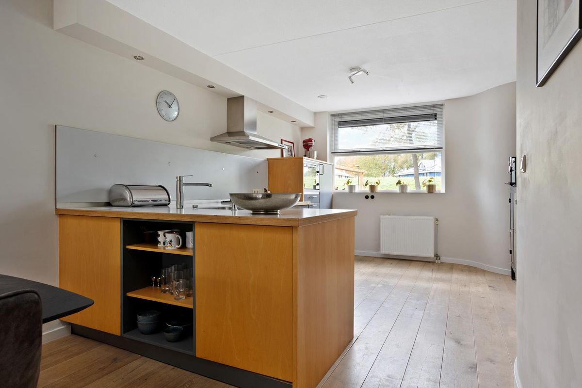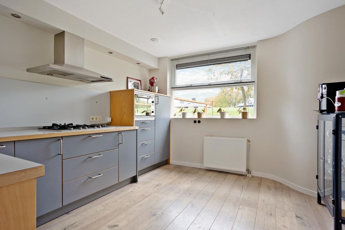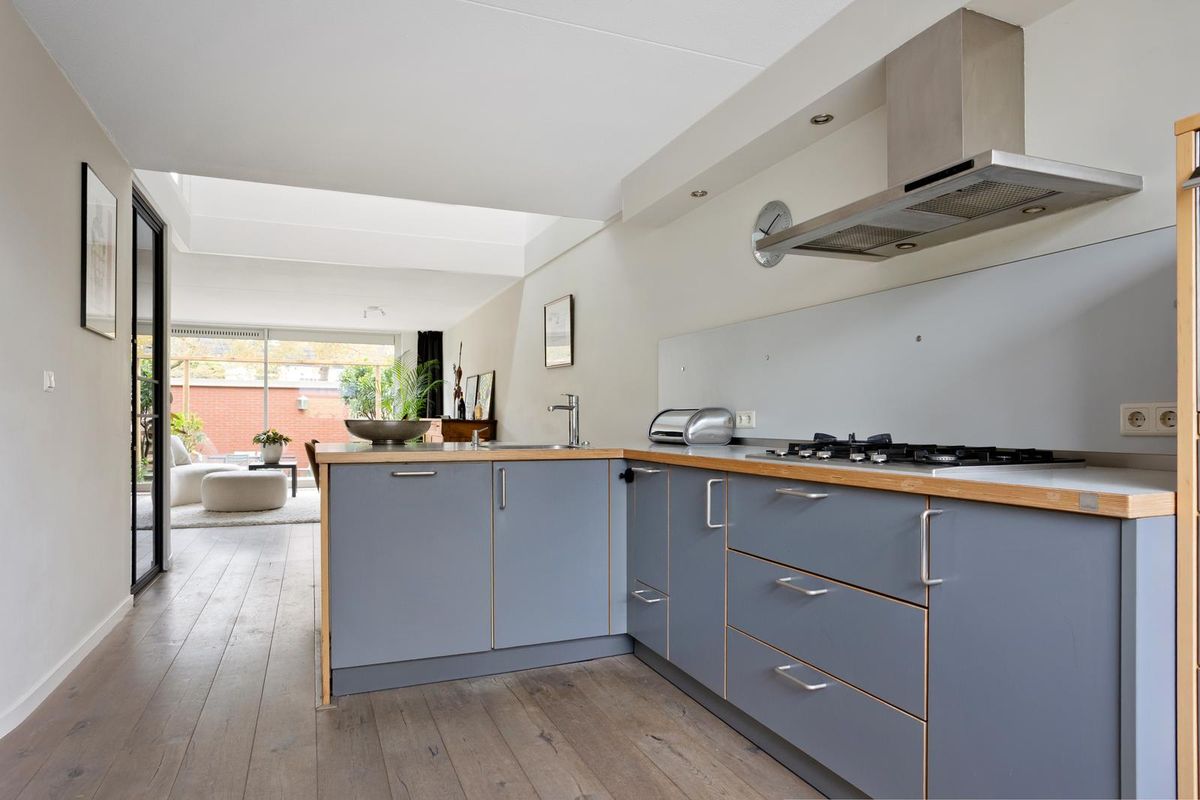 Aan de achterzijde bevindt zich de tuingerichte woonkamer met grote glazen schuifpui en houten vloer – een sfeervolle plek met uitzicht op het groen. Aan de voorzijde ligt de L-vormige keuken, voorzien van een oven, ingebouwde koelkast, vijfpits gaskookplaat, vaatwasser en veel kastruimte. De stijlvolle taatsdeur tussen keuken en woonkamer versterkt het open, lichte karakter van het huis.