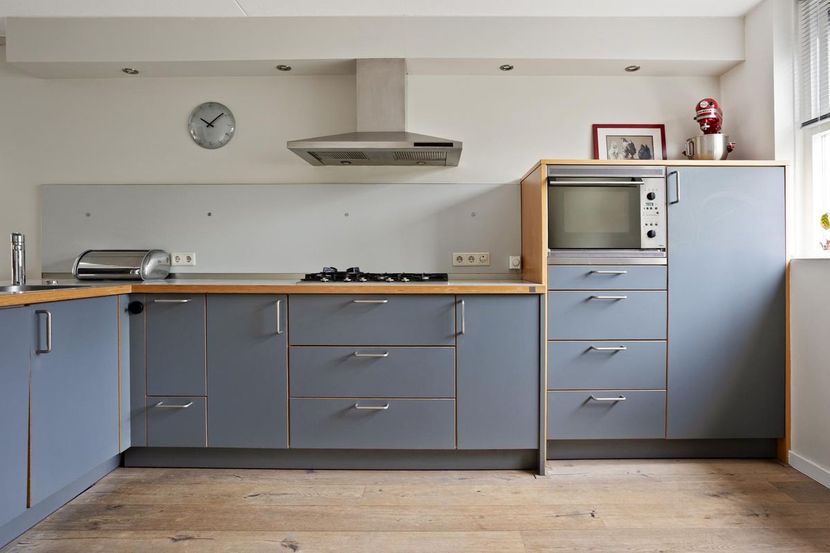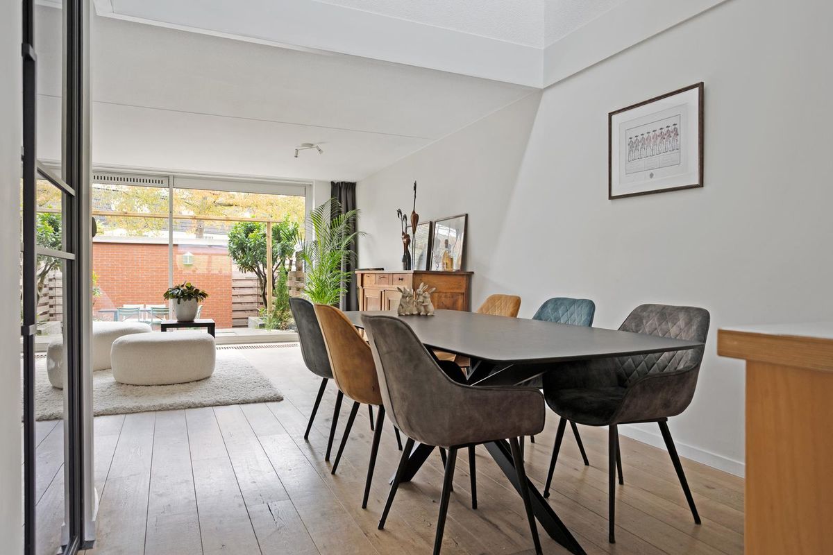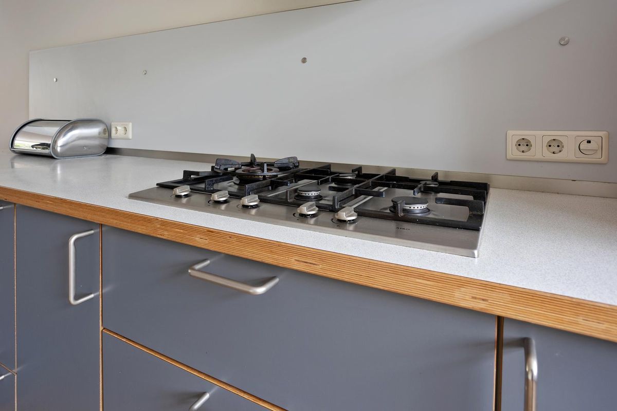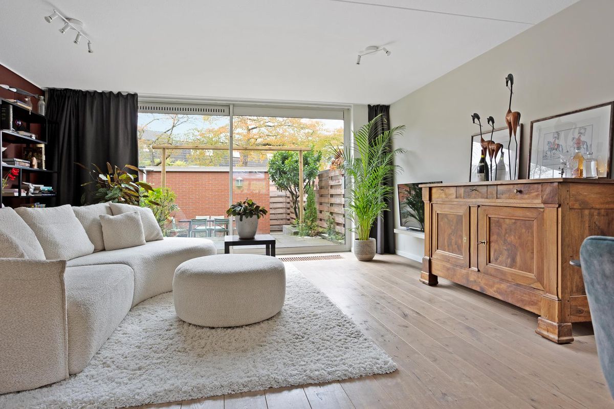 Aan de achterzijde bevindt zich de tuingerichte woonkamer met grote glazen schuifpui en houten vloer – een sfeervolle plek met uitzicht op het groen. Aan de voorzijde ligt de L-vormige keuken, voorzien van een oven, ingebouwde koelkast, vijfpits gaskookplaat, vaatwasser en veel kastruimte. De stijlvolle taatsdeur tussen keuken en woonkamer versterkt het open, lichte karakter van het huis.