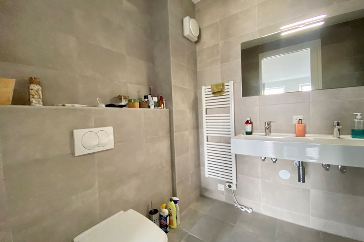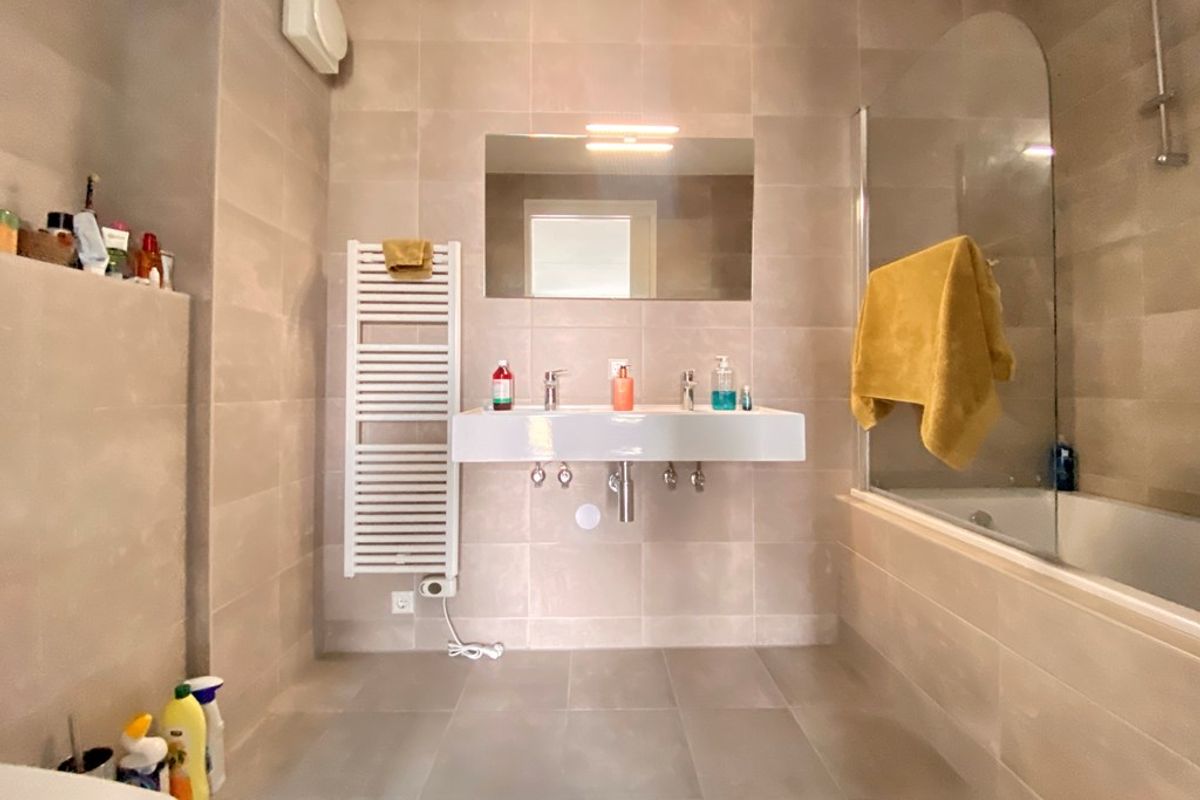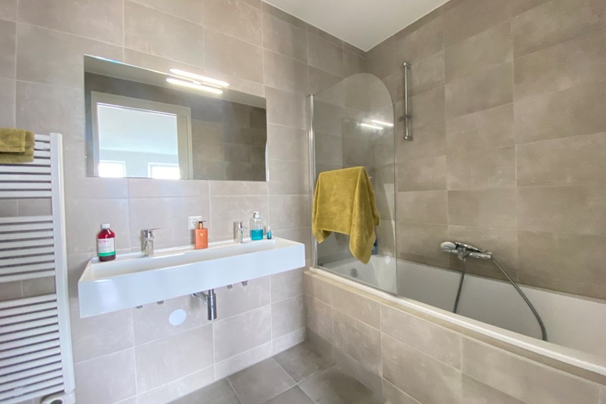 De volledig betegelde badkamer is voorzien van een ligbad met douchegelegenheid, een toilet en een dubbele wastafel met spiegel.