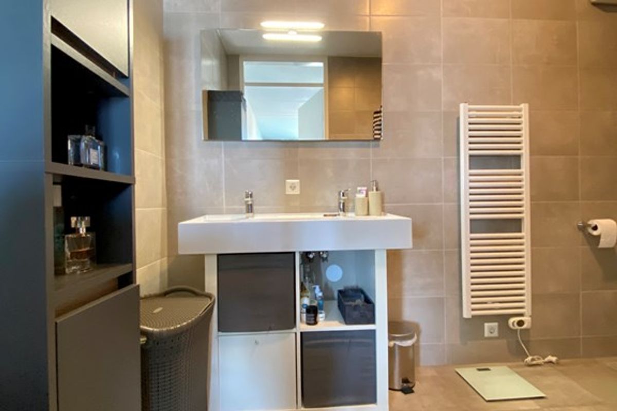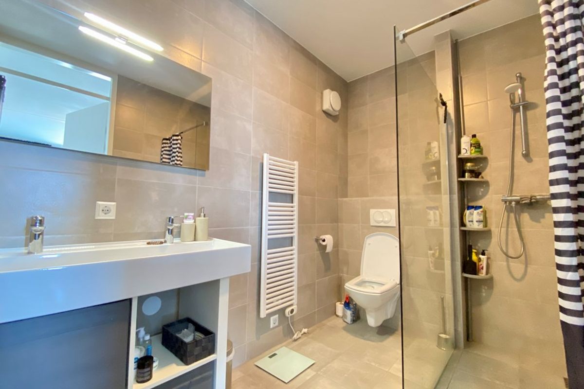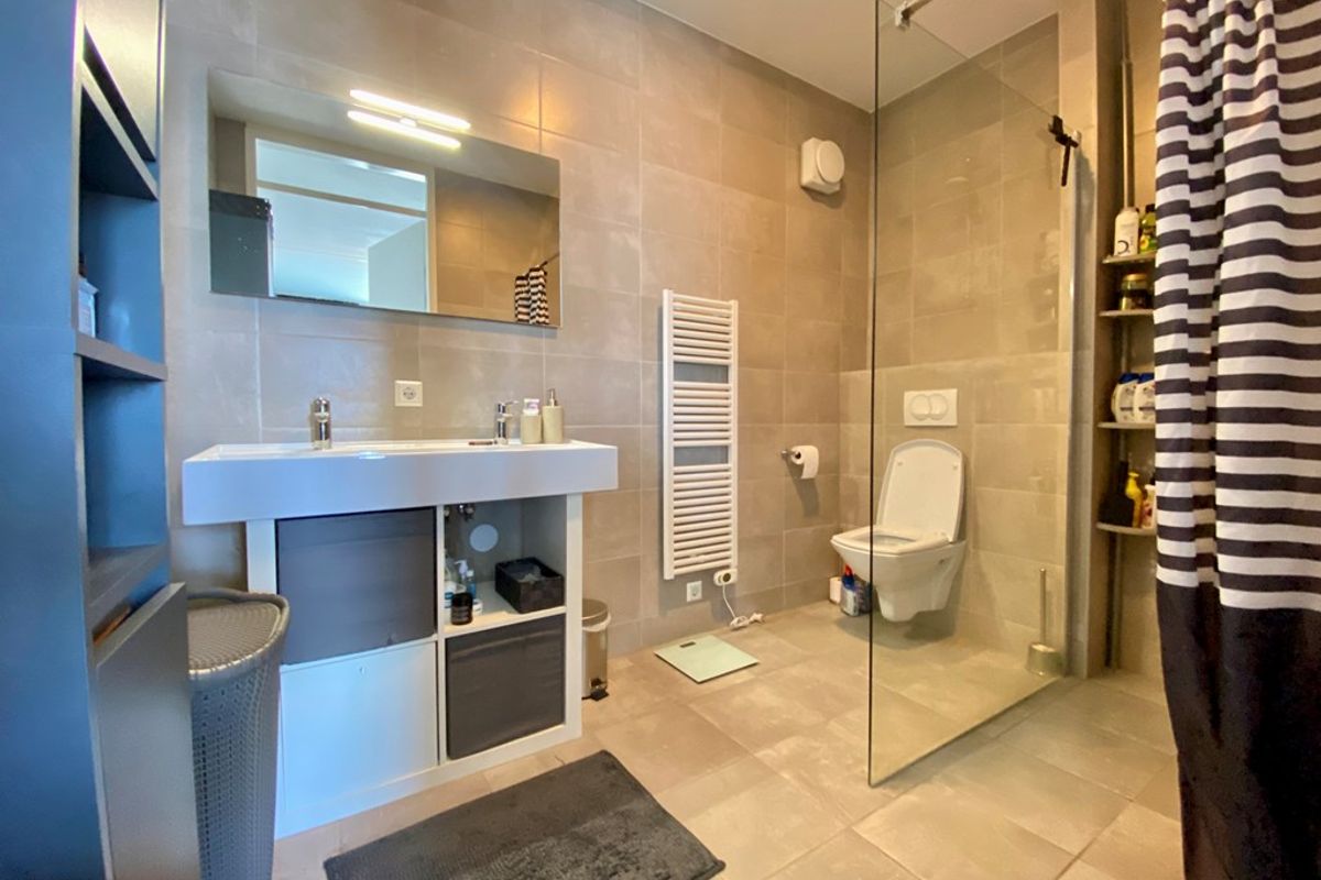 Vanuit hier is er toegang tot de volledig betegelde badkamer met een dubbele wastafel, een toilet en inloopdouche.