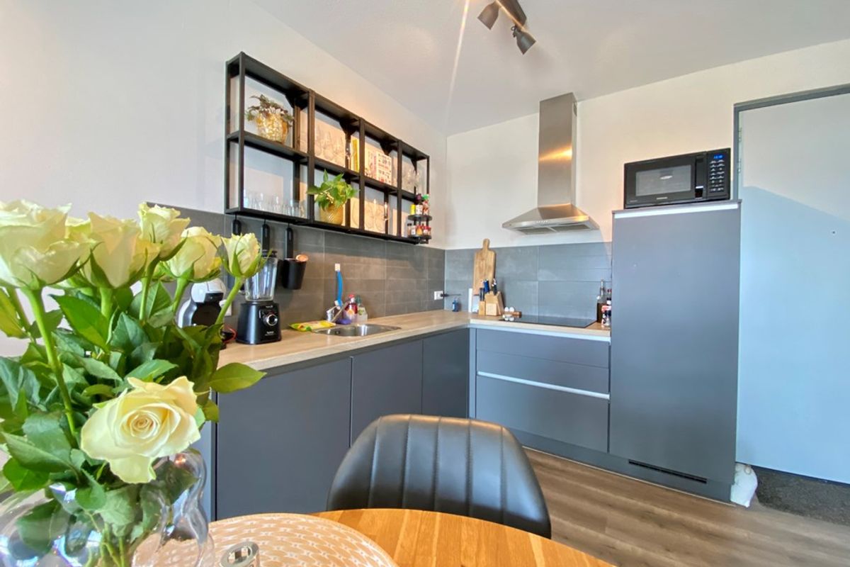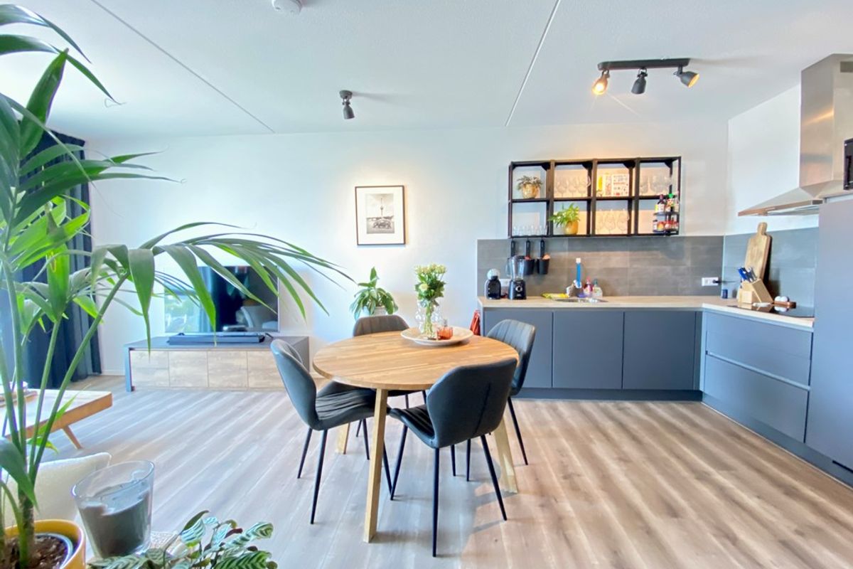 Lichte woonkamer met open keuken, voorzien van een inductiekookplaat, koelkast met vriesvak en een vaatwasser.