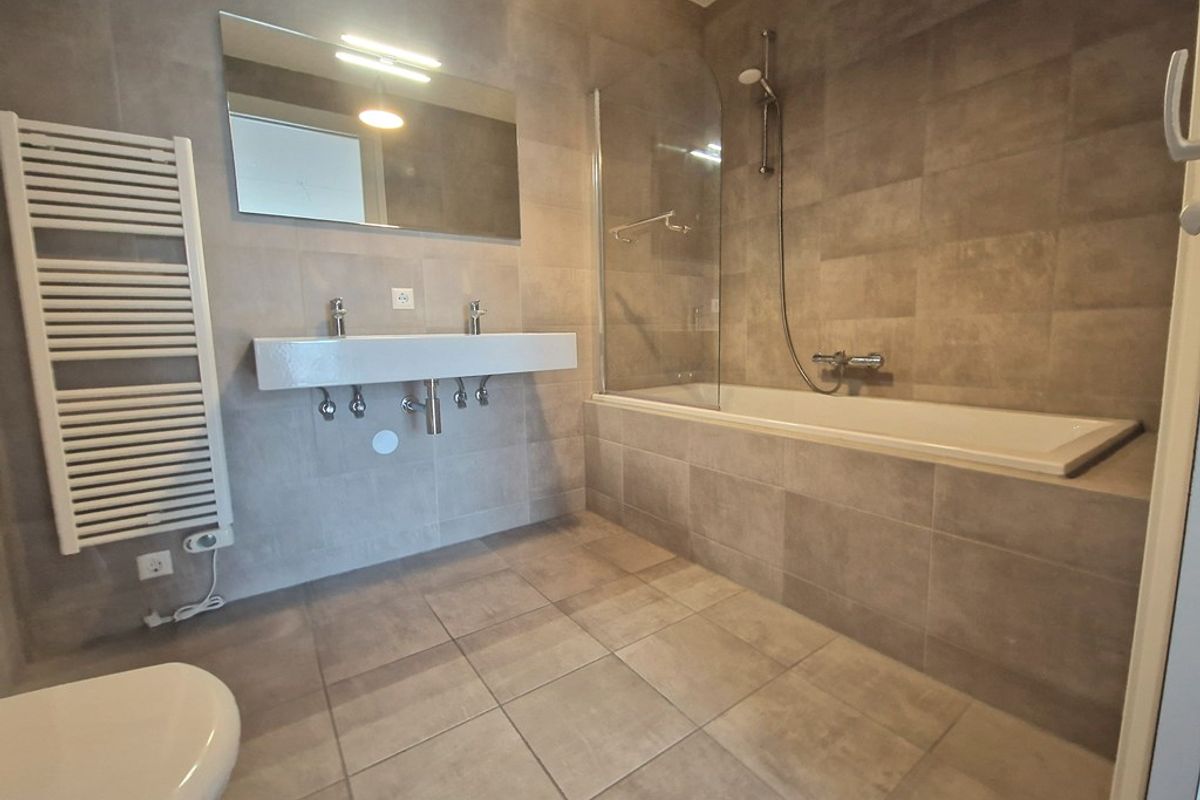 De volledig betegelde badkamer is voorzien van een ligbad met douchegelegenheid, een toilet en een dubbele wastafel met spiegel.