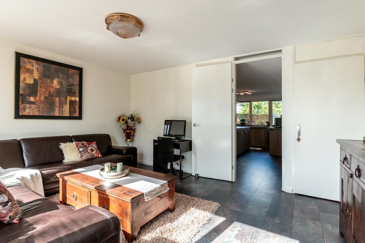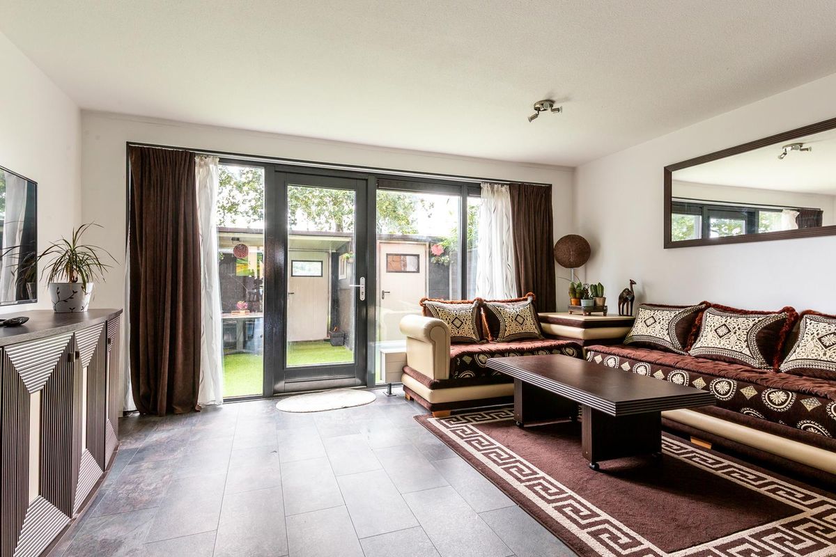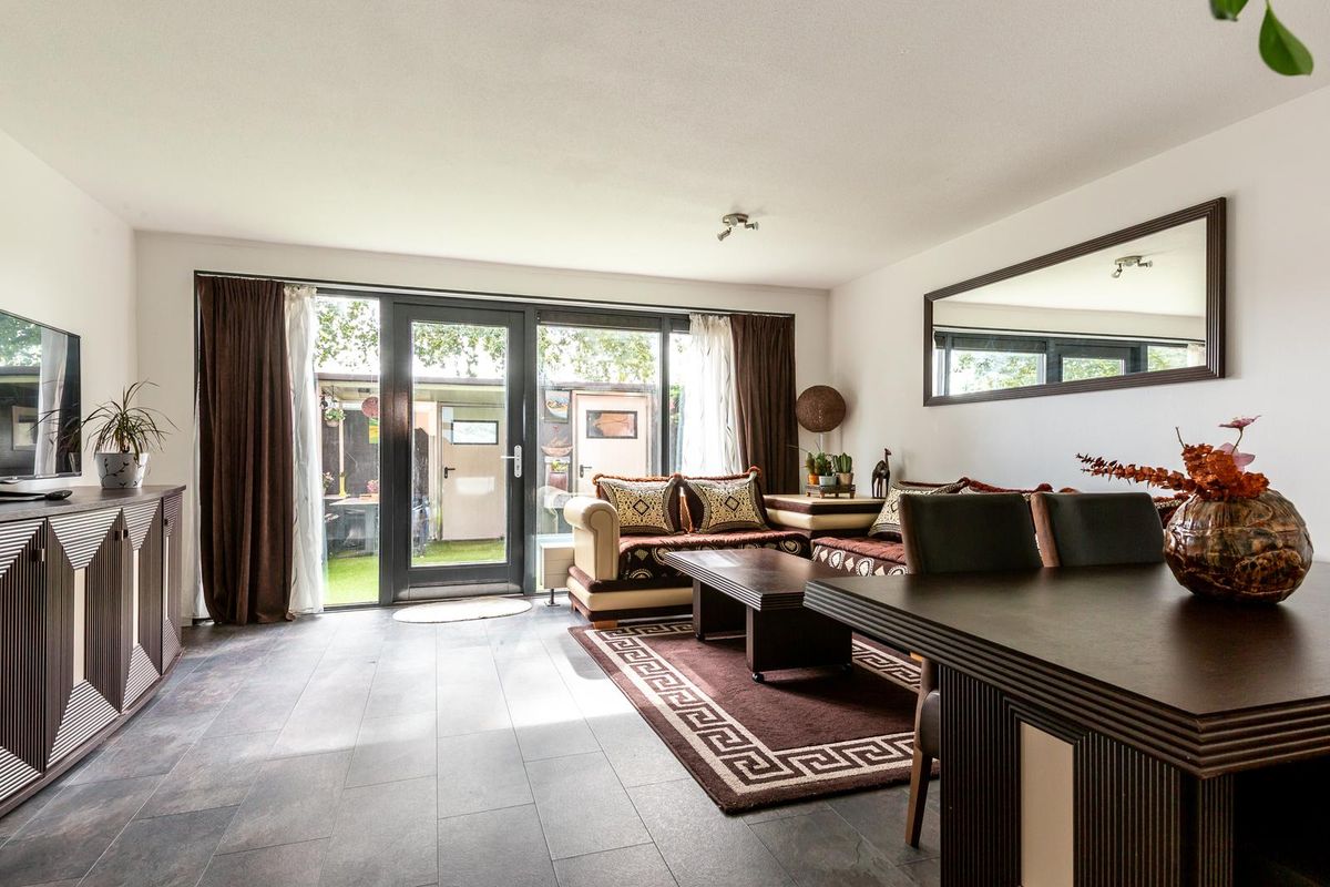 Loop je verder door, dan kom je in de tuingerichte woonkamer. Een lichte en gezellige ruimte met toegang tot de achtertuin. De tuin is onderhoudsvriendelijk aangelegd met keramische tegels en daar bovenop ligt kunstgras en beschikt over een fijne overkapping waar je het hele jaar door kunt genieten. Achterin de tuin staat een extra schuur voor fietsen en opslag. Dankzij de achterom kun je met de fiets eenvoudig via de achterzijde naar binnen.