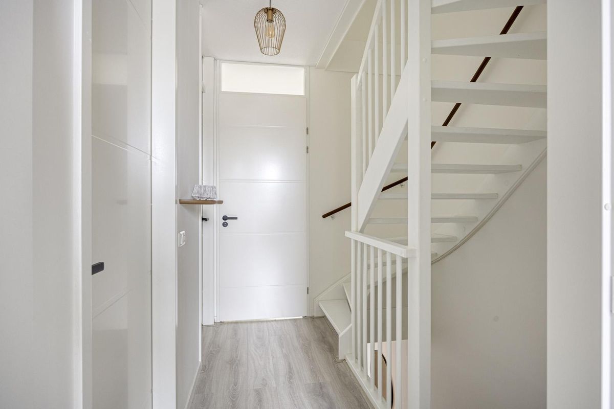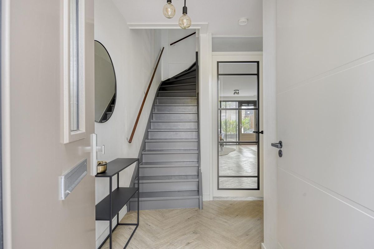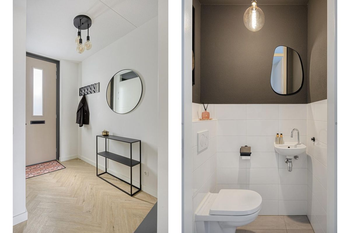 Parkeren doe je op het afgesloten terrein aan de achterzijde, waar je twee eigen parkeerplaatsen hebt, hoe fijn is dat! Via de onderhoudsvriendelijke voortuin kom je de woning binnen in een verzorgde hal met een stijlvolle PVC visgraatvloer, moderne toiletruimte en een donker gekleurde trap naar boven. Er is volop ruimte voor een garderobe, en de meterkast is handig weggewerkt.
