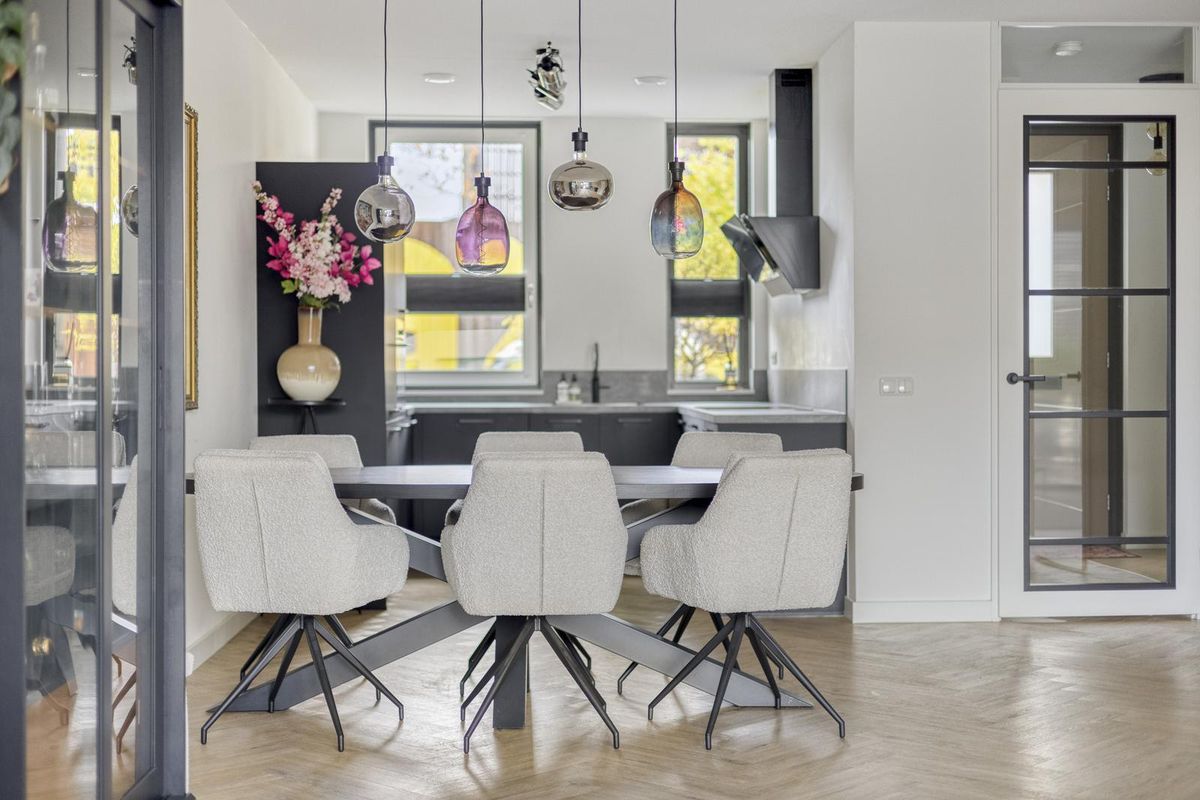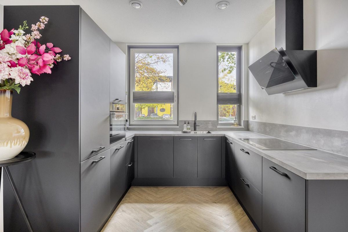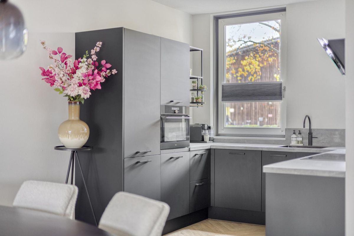 De woonkamer is ruim, licht en strak afgewerkt met renovlies wanden en dezelfde fraaie PVC vloer als in de hal. Het zitgedeelte ligt aan de achterzijde, met uitzicht op de tuin. Hier past met gemak een grote loungebank! Centraal in de ruimte is plek voor een royale eettafel, en de trapkast biedt extra bergruimte. Extra comfort? Ja hoor: er is airco aanwezig. Aan de voorzijde vind je de moderne U-keuken in antraciet met zwarte grepen en een stoer betonlook blad. Uiteraard compleet met zwarte Quooker, combi-oven, koel-vriescombi, inductiekookplaat en afzuigkap. Een keuken om van te houden, en om in te koken!