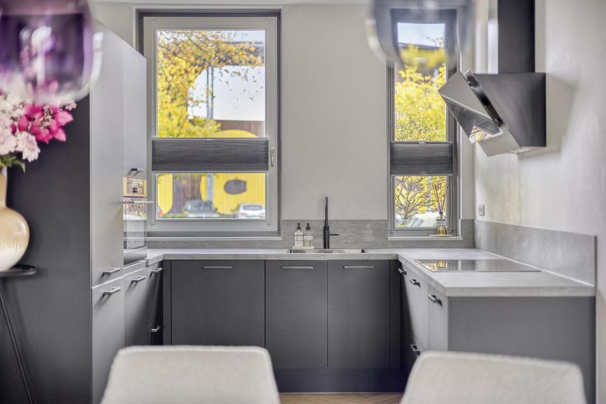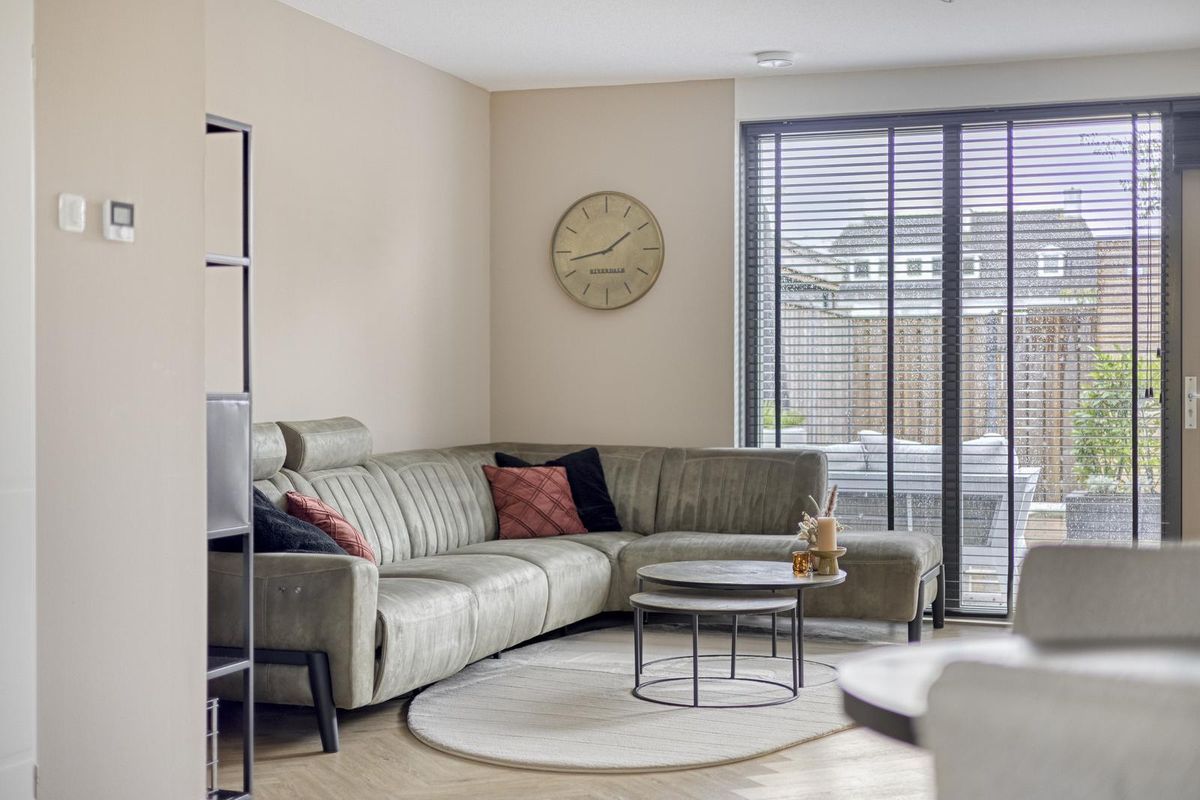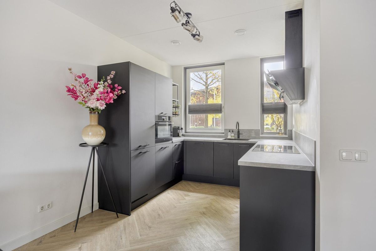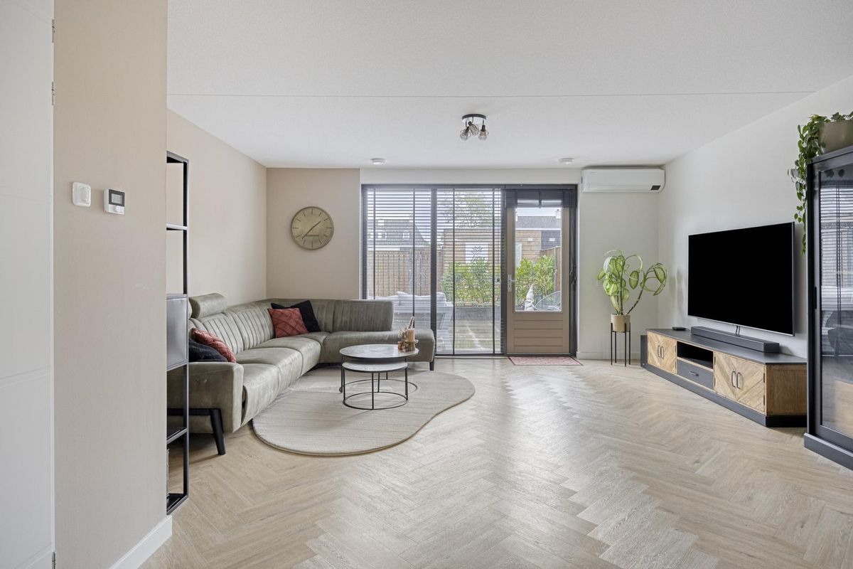 De woonkamer is ruim, licht en strak afgewerkt met renovlies wanden en dezelfde fraaie PVC vloer als in de hal. Het zitgedeelte ligt aan de achterzijde, met uitzicht op de tuin. Hier past met gemak een grote loungebank! Centraal in de ruimte is plek voor een royale eettafel, en de trapkast biedt extra bergruimte. Extra comfort? Ja hoor: er is airco aanwezig. Aan de voorzijde vind je de moderne U-keuken in antraciet met zwarte grepen en een stoer betonlook blad. Uiteraard compleet met zwarte Quooker, combi-oven, koel-vriescombi, inductiekookplaat en afzuigkap. Een keuken om van te houden, en om in te koken!