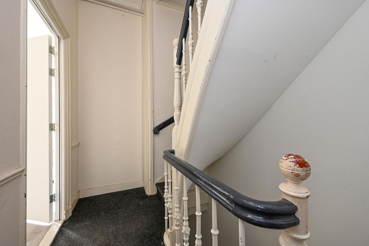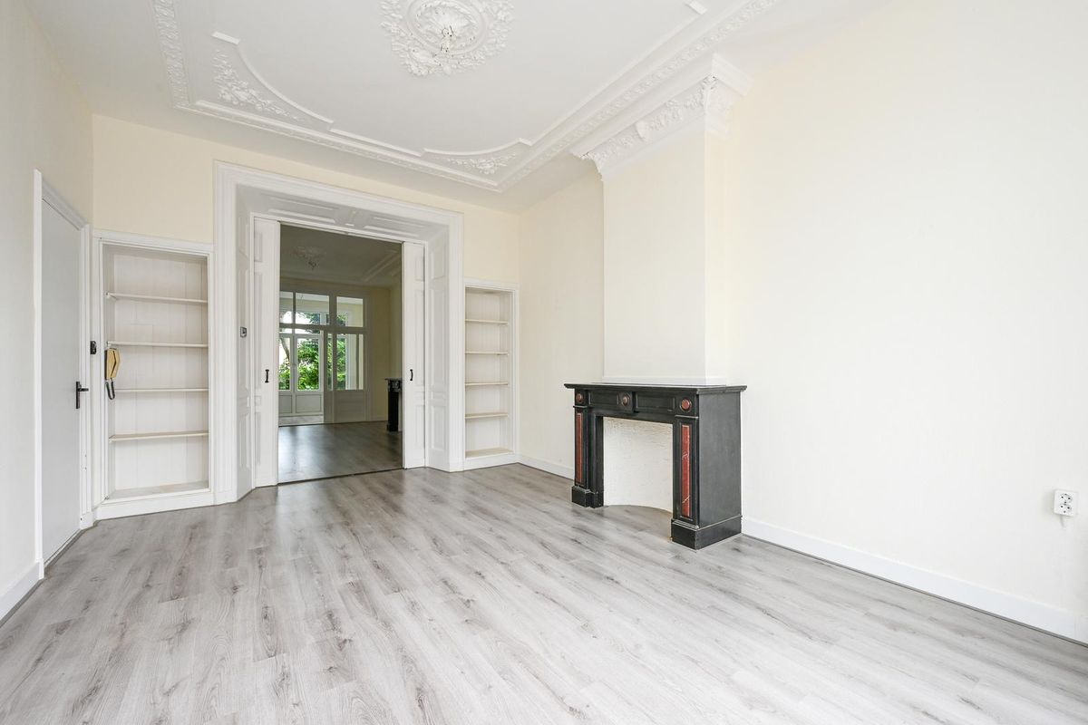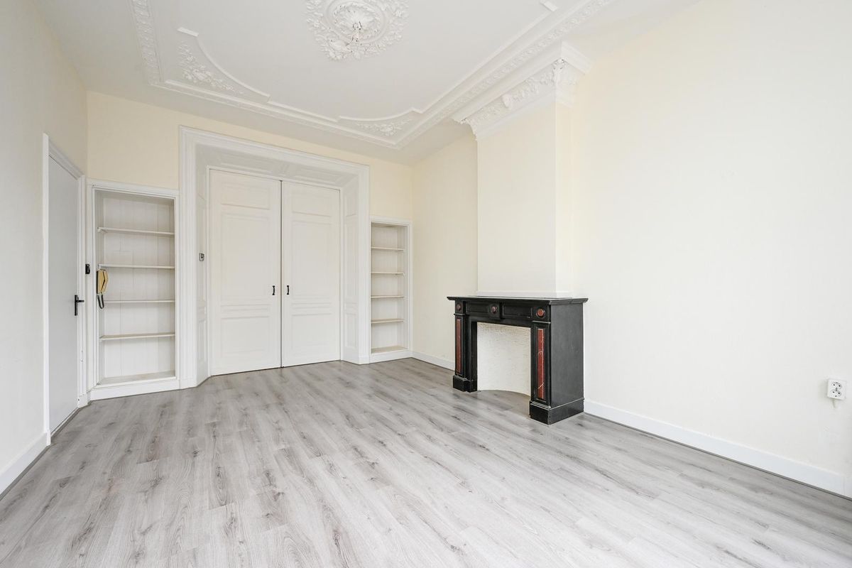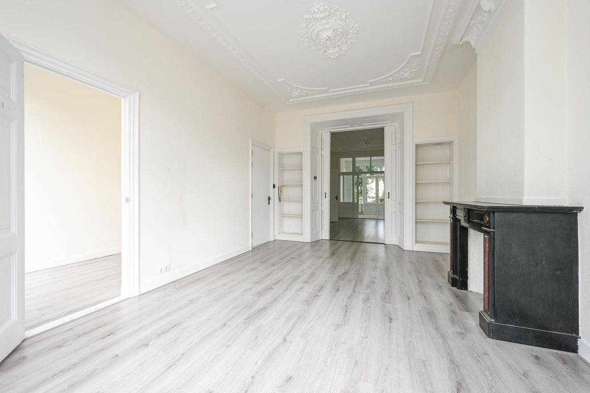De ruime woonkamer ensuite heeft een hoog plafond met prachtige ornamenten, wat direct zorgt voor een sfeervolle en statige uitstraling. De halfopen keuken sluit praktisch aan op de woonkamer en creëert een lichte en open woonbeleving. Moderne en keurige volbetegelde badkamer.