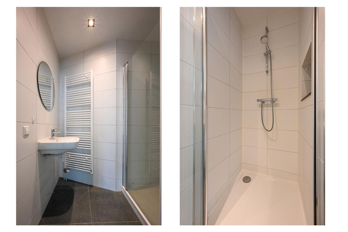 Via de tussenhal bereikt u een modern, separaat toilet, volledig betegeld en voorzien van een hangcloset met inbouwreservoir en een fonteintje. De badkamer is eveneens volledig betegeld en beschikt over een douchegelegenheid met handige nis, vaste wastafel en een handdoekenradiator.