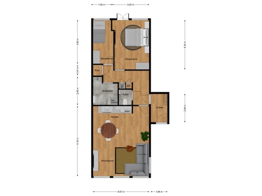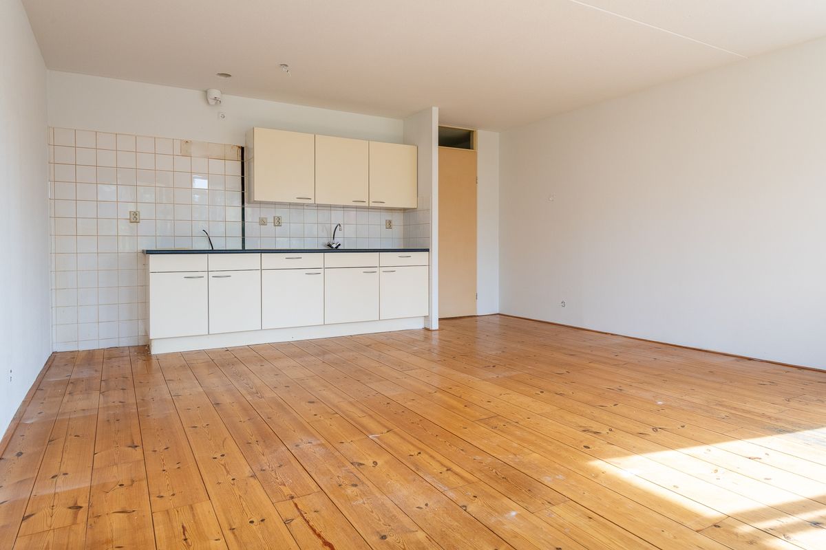 De ruime woonkamer met open keuken (ca. 4.87 m x 6.10 m) voorzien van houten vloer, grote raampartijen welke zorgen voor veel licht;