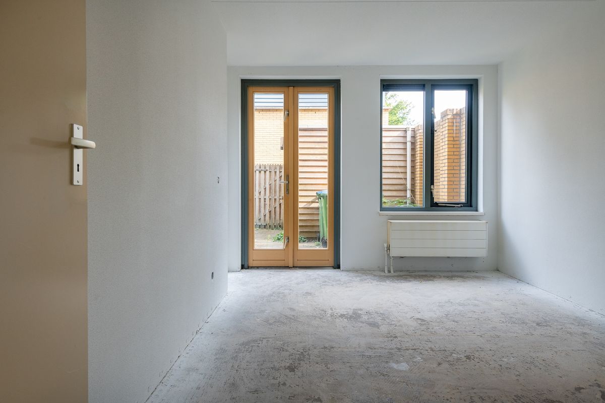 Slaapkamer achterzijde (ca. 3.20 m x 4.30 m) voorzien van betonnen vloer, middels openslaande deuren toegang tot de tuin;