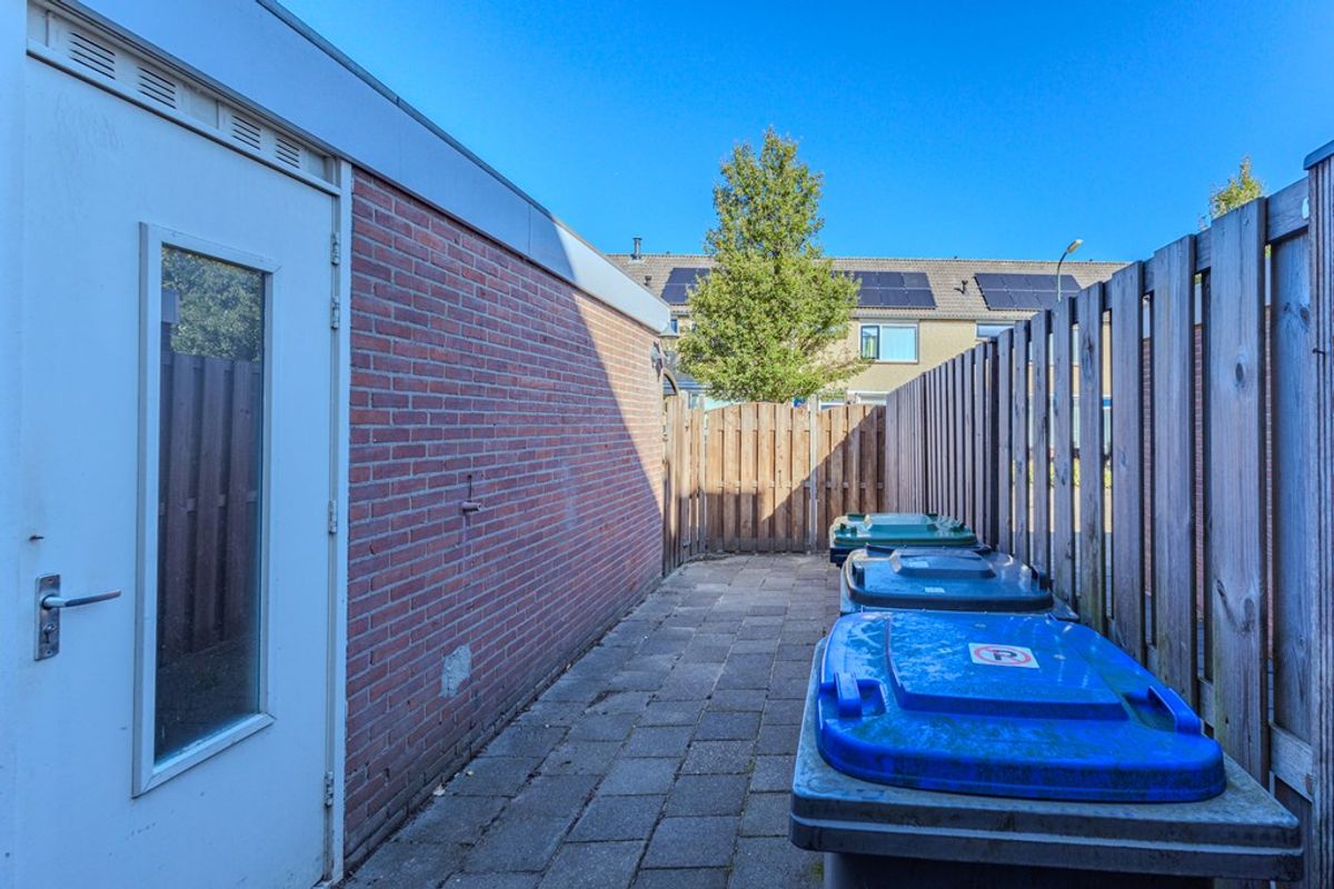 De zonnige achtertuin ligt op het zuiden en is voorzien van een zonnescherm dat aan de gevel is bevestigd. Het geheel is omheind met een schutting en heeft een achterom. Daarnaast is er een kleine overkapping aanwezig, compleet met een plantenborder.