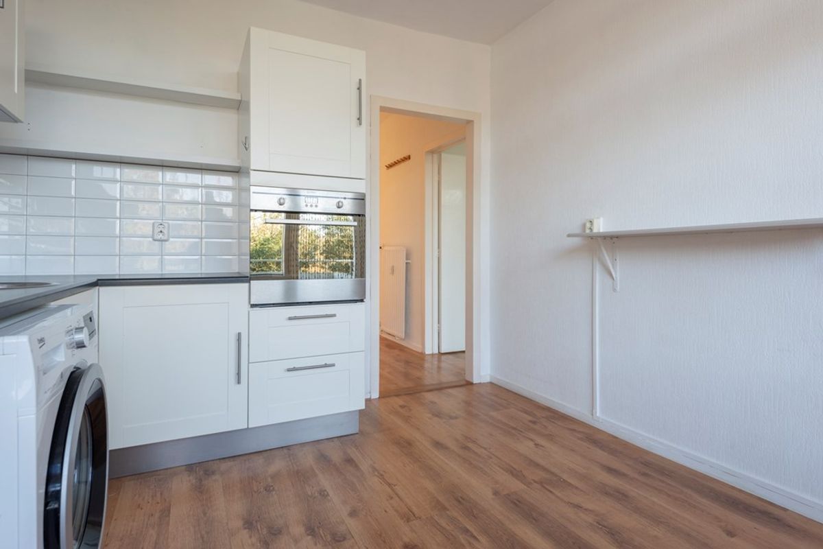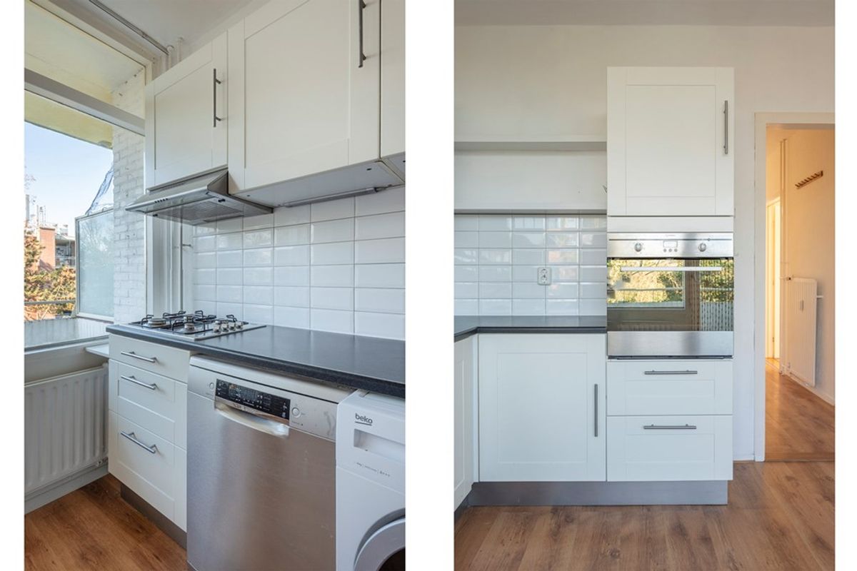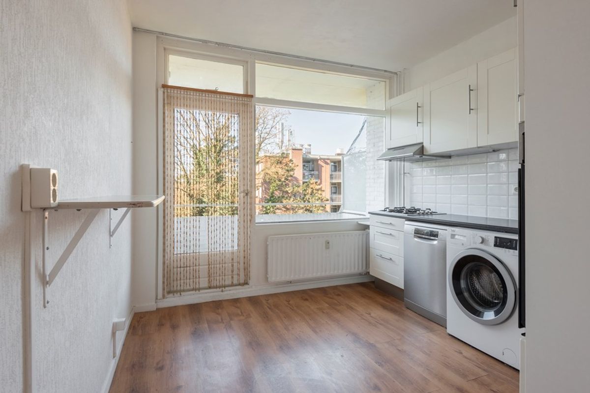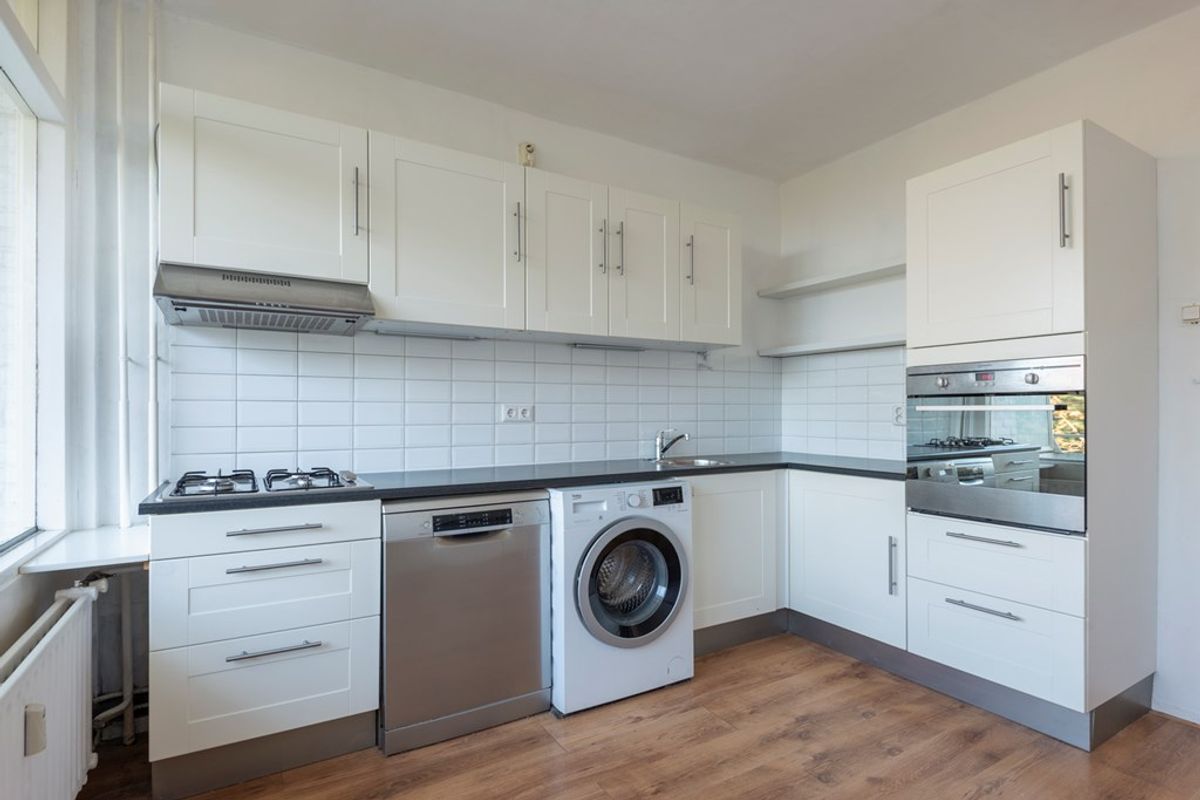 De woonkamer heeft vrij uitzicht over groen en is voorzien van een inbouwkast en de glasvezelaansluiting. De separate keuken is eventueel bij de woonkamer te betrekken en is netjes onderhouden. In de keuken zijn diverse apparaten te vinden, waaronder een 4-pits gasfornuis, afzuigkap, vaatwasser en oven (Indesit). De keuken heeft voldoende kastruimte en in deze ruimte is ook de wasmachineopstelling gerealiseerd.