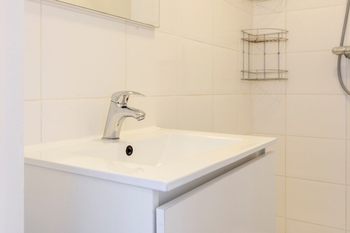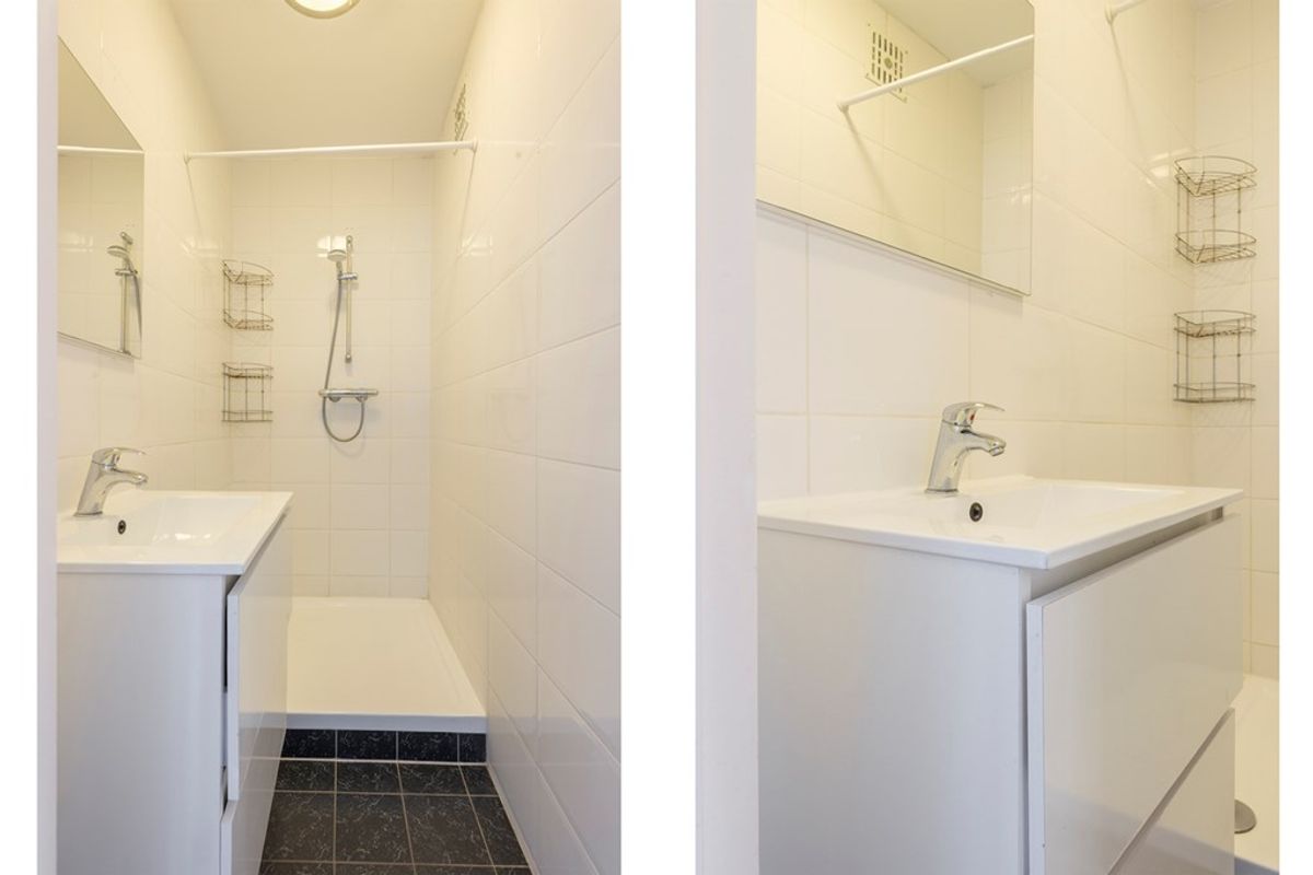 De badkamer is netjes afgewerkt en volledig betegeld in neutrale kleurstelling. Het toilet bevindt zich in een separate ruimte en is eveneens netjes.