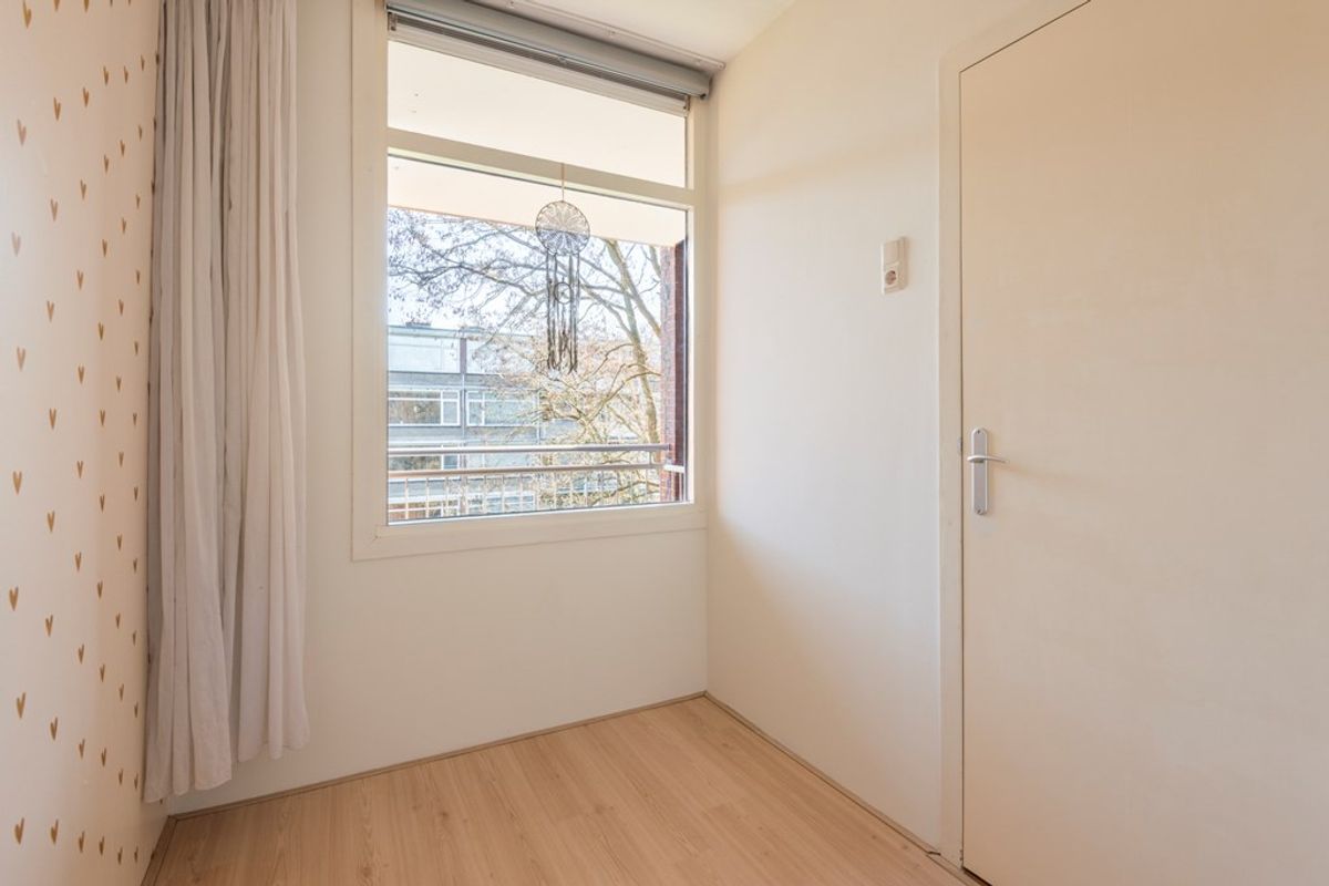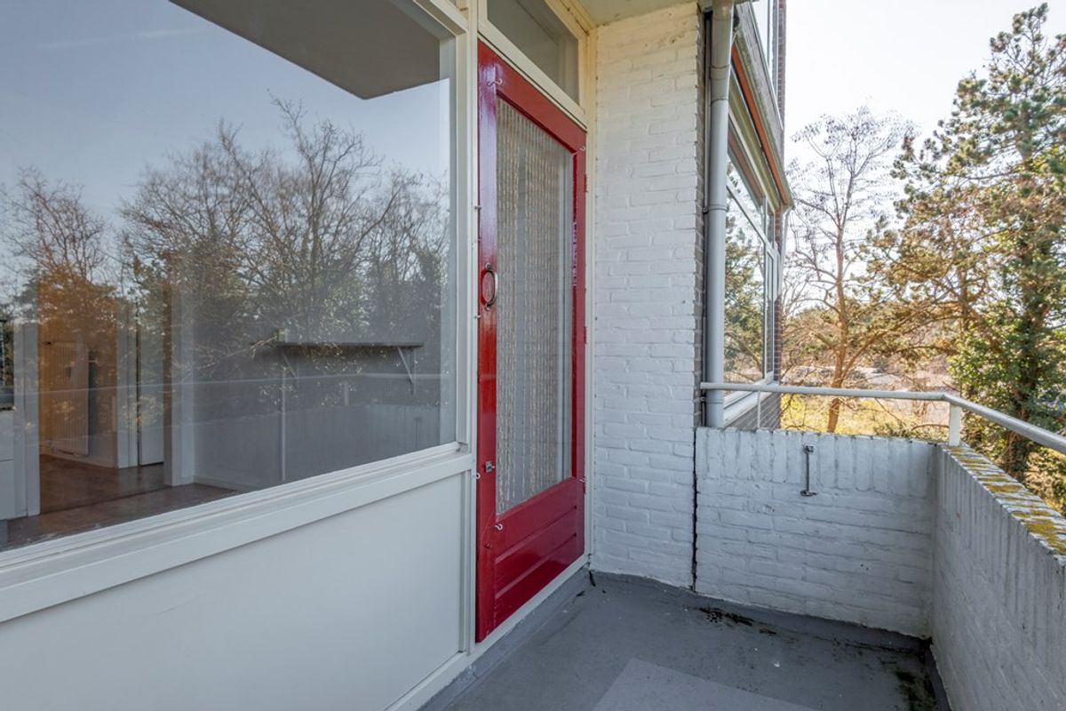 Het balkon (zuidwesten) is fijn en geeft een gevoel van privacy door het uitzicht op groen. Op de galerij is een inbouwkast te vinden waar de elektrische boiler (2022) zich bevindt.