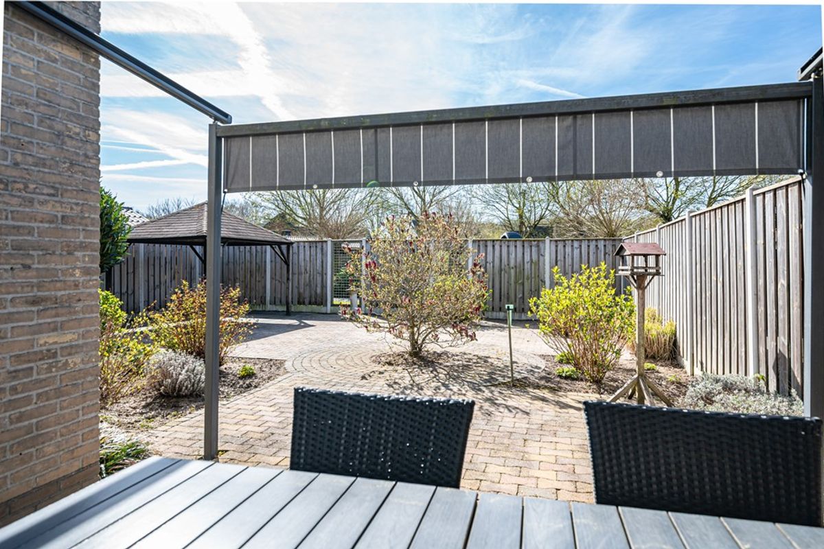 De zonnige achtertuin op het zuiden is verzorgd aangelegd en beschikt over meerdere terrassen, een prieeltje en een elektrisch zonnescherm. Een heerlijke plek om in alle rust van het buitenleven te genieten, met volop privacy dankzij de groene achterzijde.