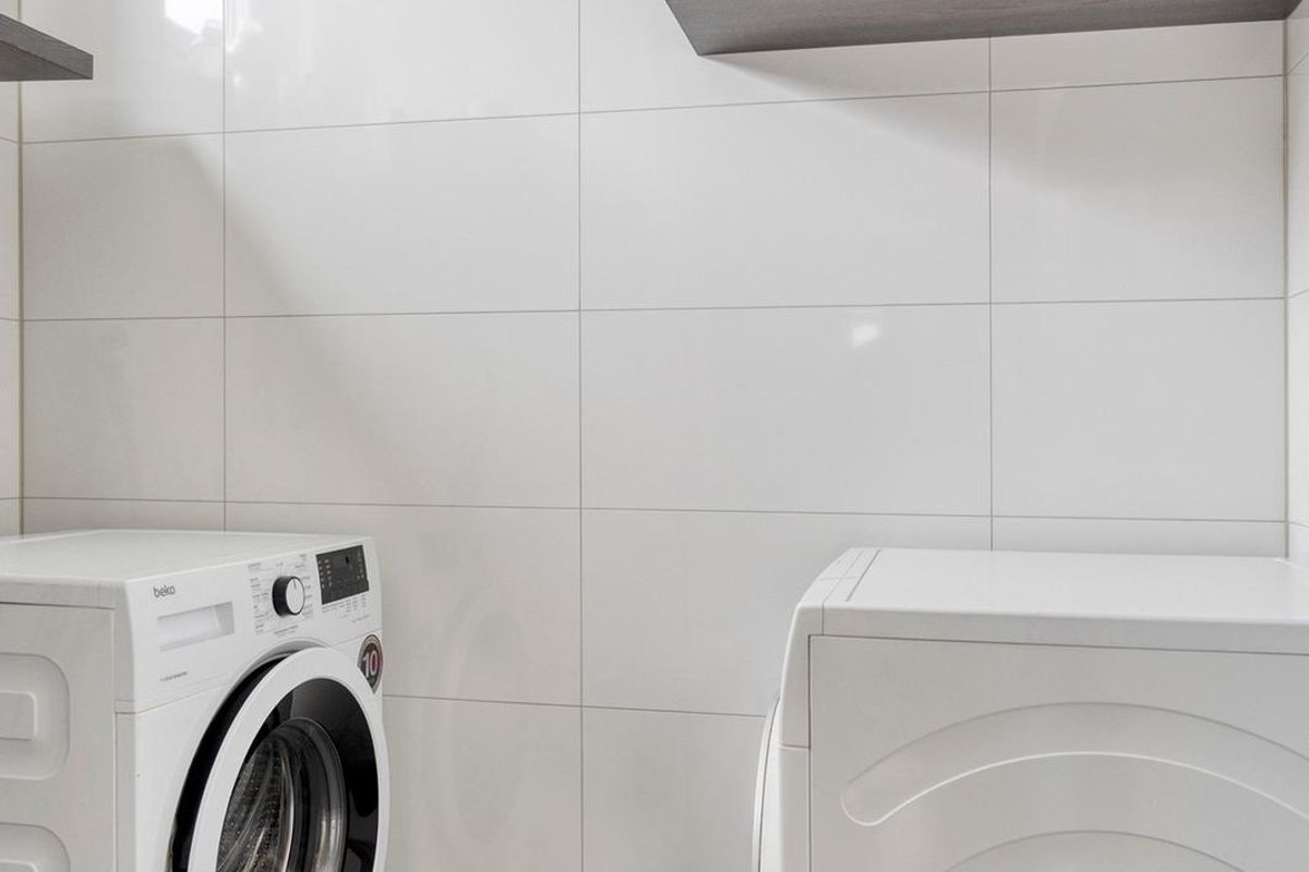 Aan de achterzijde bevindt zich de master bedroom, uitgerust met tv-aansluiting. Aan de voorzijde ligt een tweede slaapkamer, uitgerust met een tv-aansluiting, en daarnaast bevindt zich een aparte, praktische wasruimte met aansluitingen voor wasmachine en droger, bereikbaar vanuit de overloop.