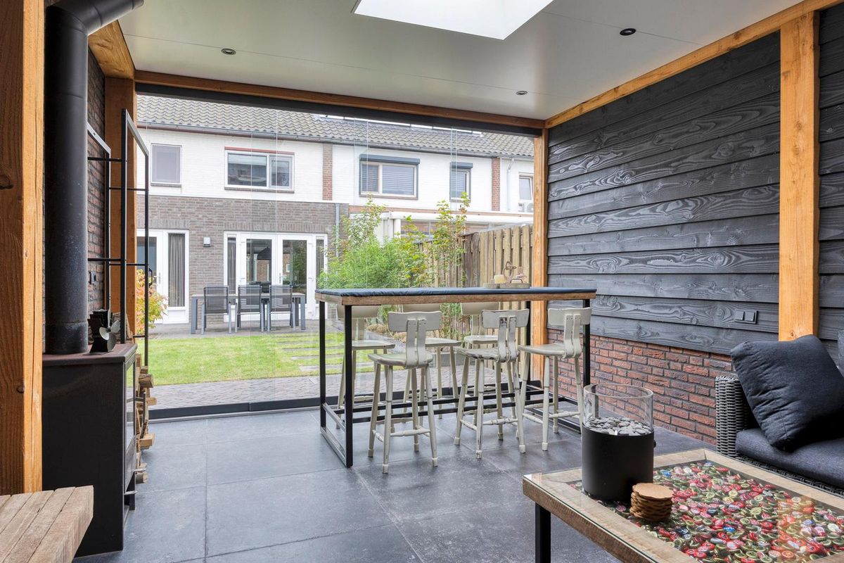 De overkapping biedt een sfeervolle ruimte om te gebruiken als loungeplek of eetruimte en beschikt eveneens over glazen schuif pui, tegel vloer, elektra en tv-aansluiting.