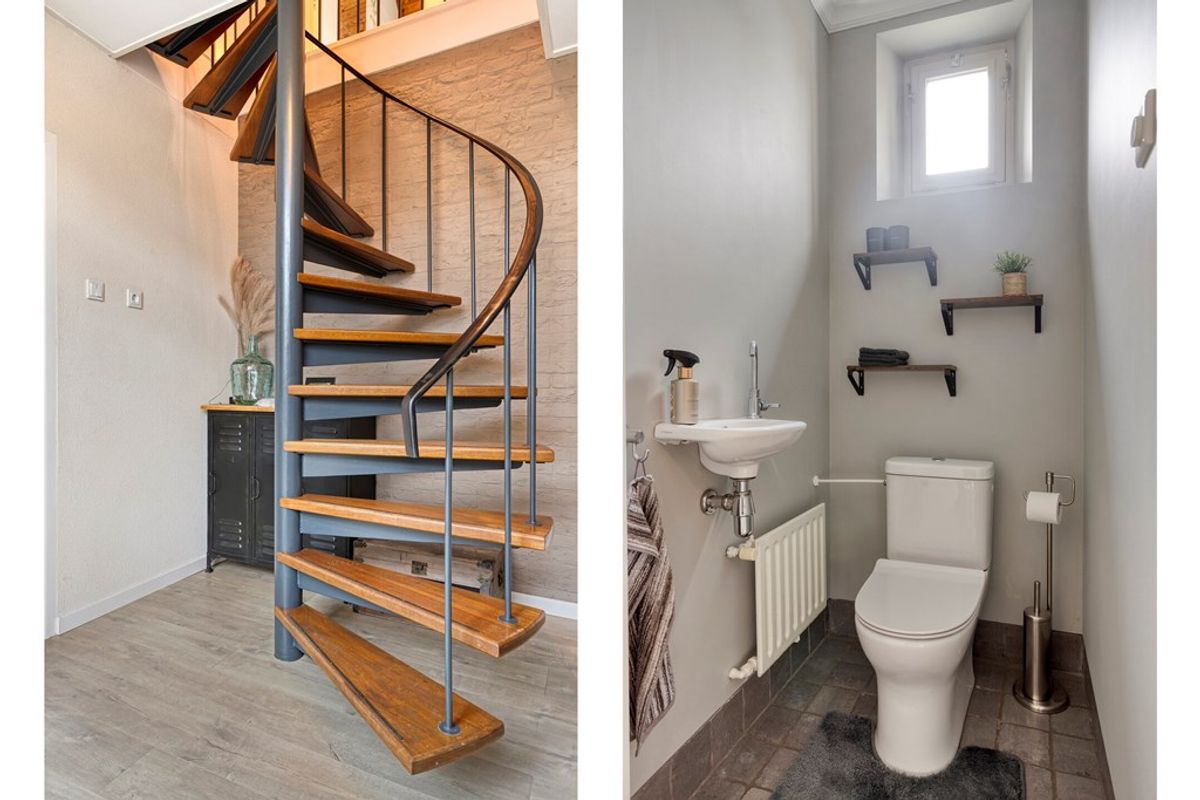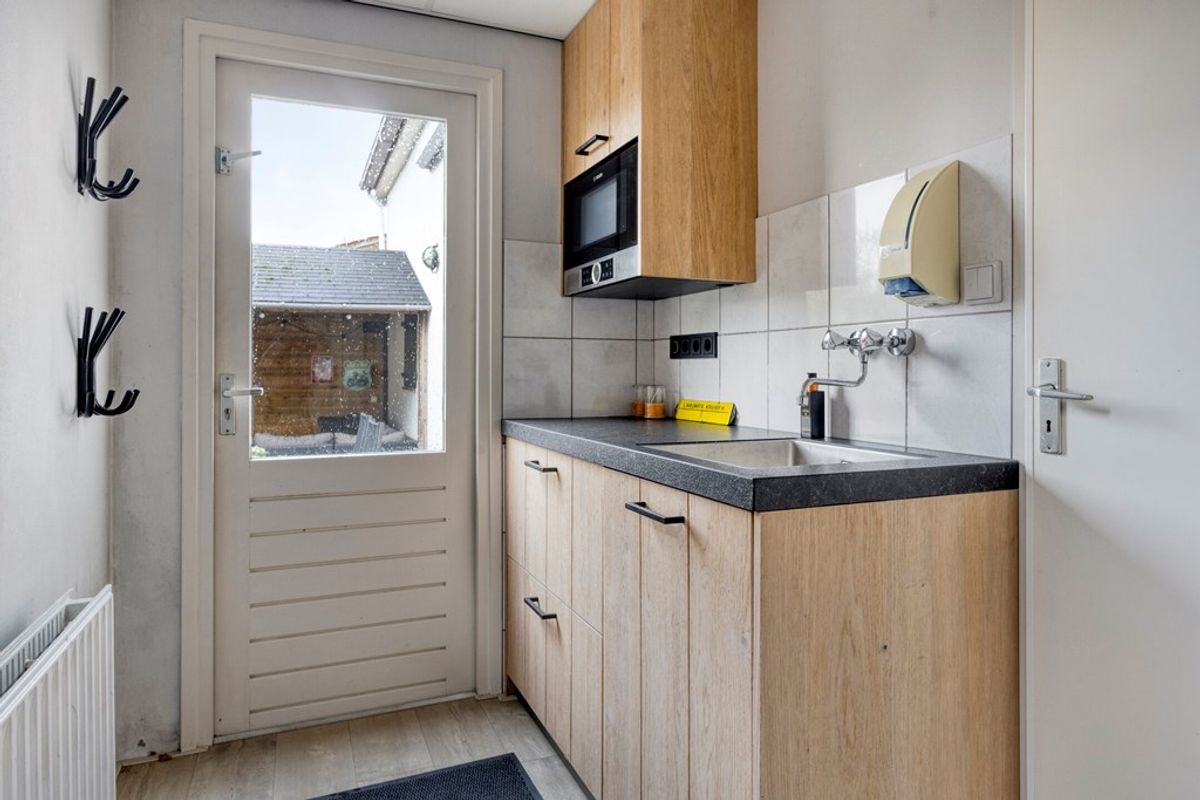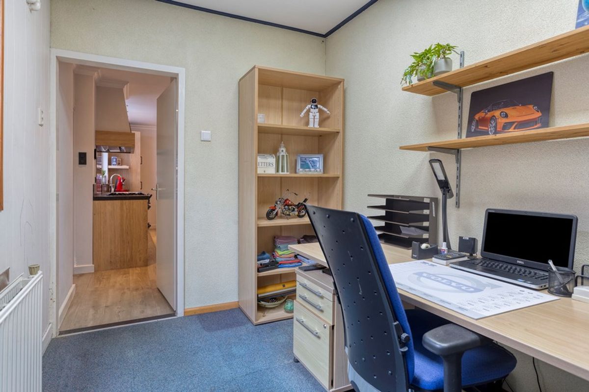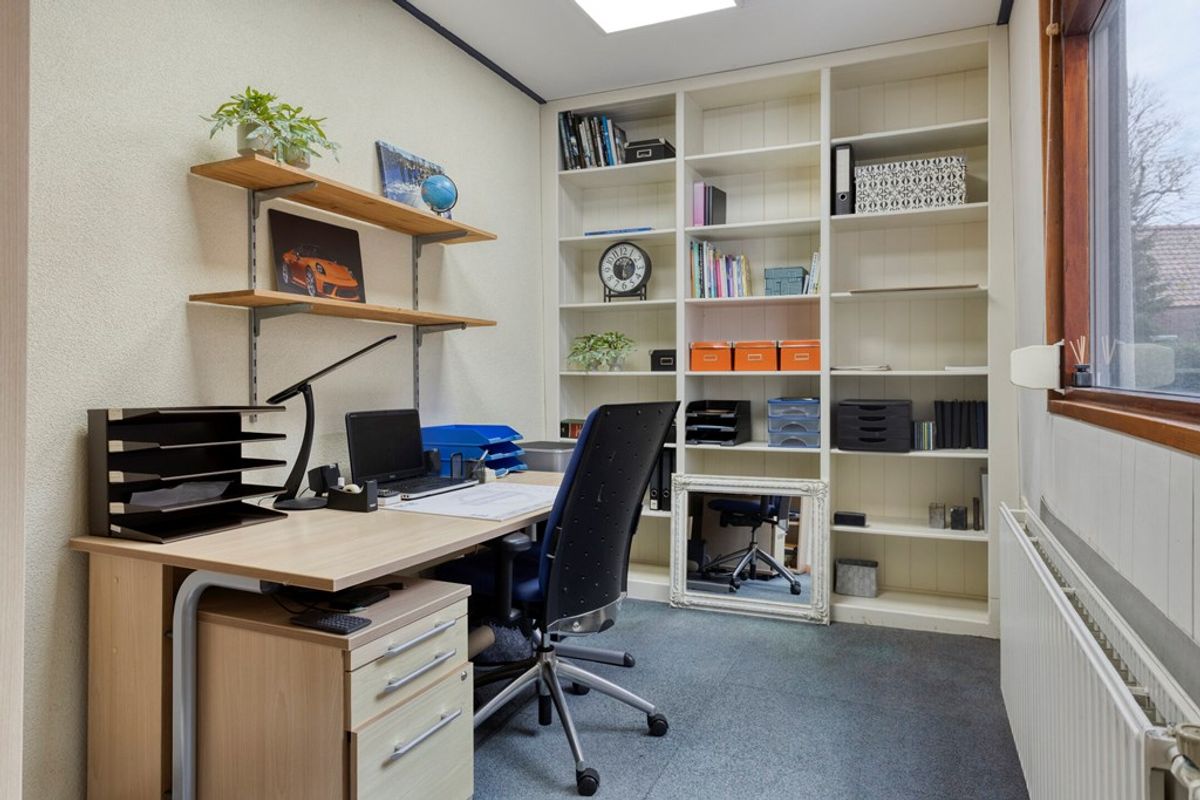 Aangrenzend vindt u een praktische kantoorruimte, ideaal voor thuiswerken en toegang tot de grote, droge kelder voor extra opslag. De bijkeuken biedt plaats aan uw witgoed en de cv-ketel.