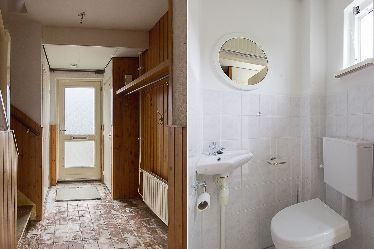 Entree met hal, kelderkast, meterkast en toiletruimte. Vanuit de hal toegang tot de woonkamer en de dichte keuken met eenvoudige inrichting en doorgang naar de achtertuin.