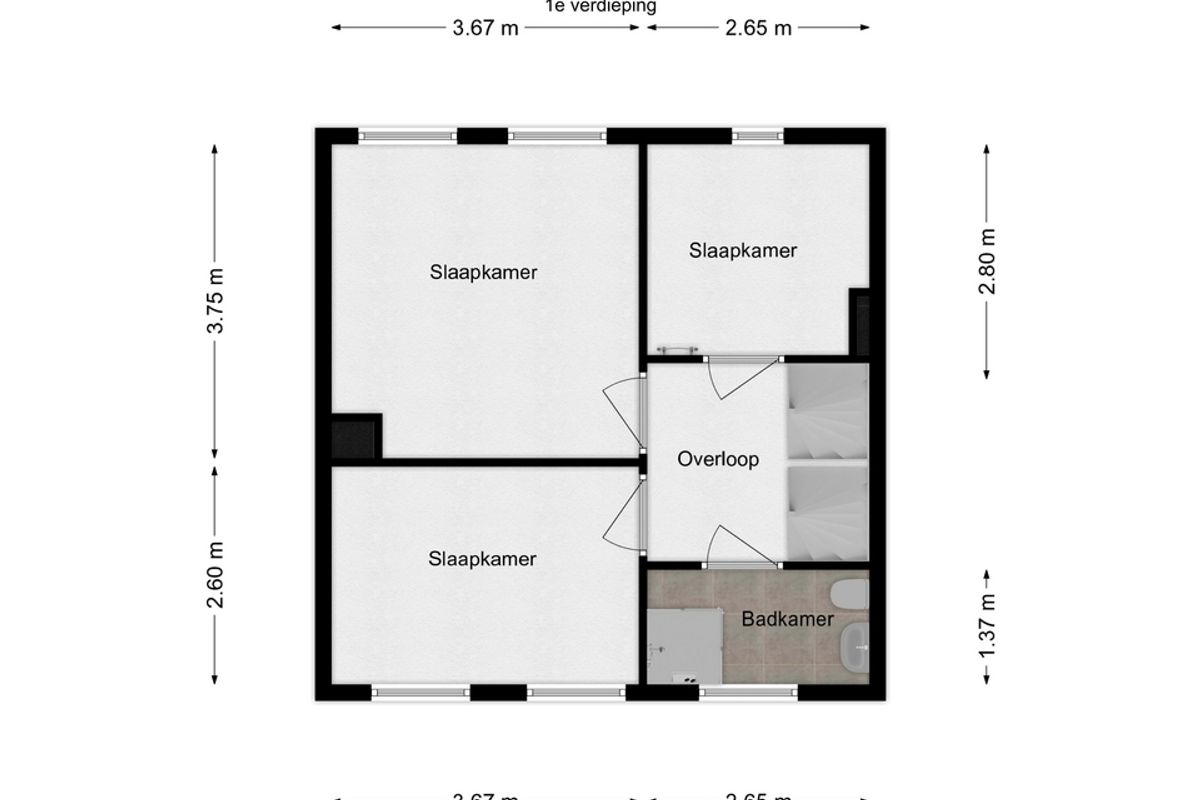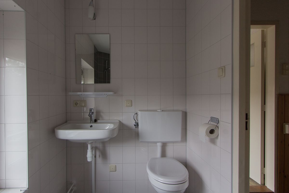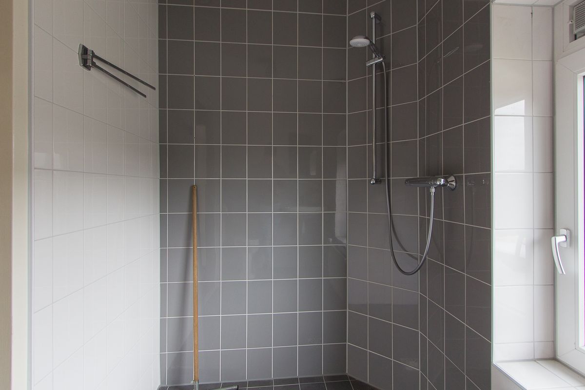 Overloop met drie slaapkamers en een badkamer met inloopdouche, toilet en wastafel.