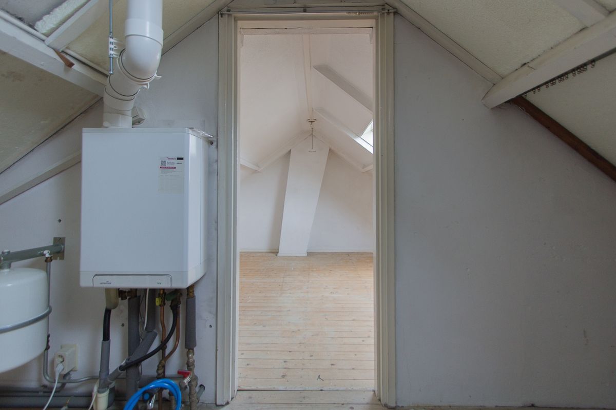 Overloop met dakraam en opstelplaats voor de cv-ketel (Intergas HR, 2019). Aansluitend een vierde slaap- of werkkamer, eveneens met dakraam.