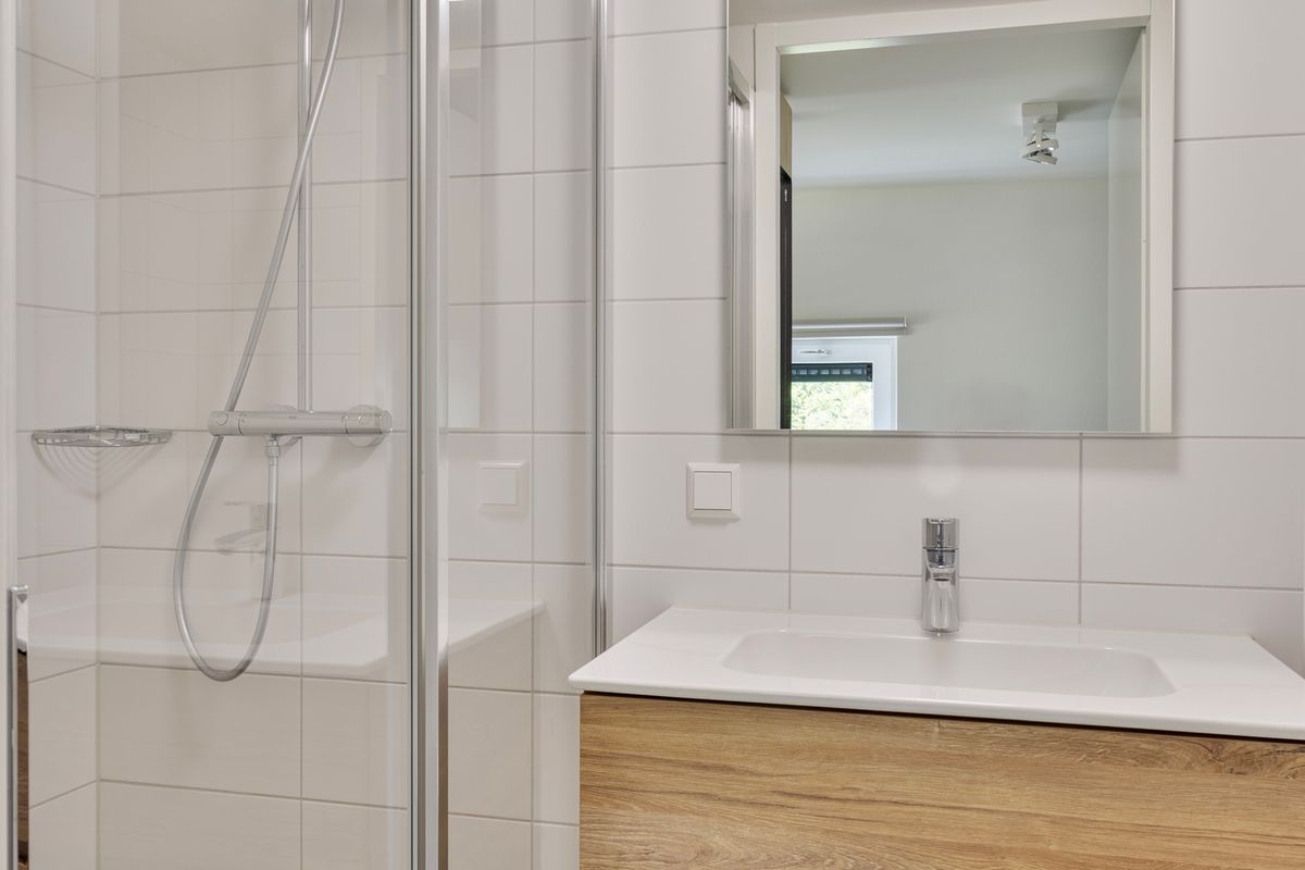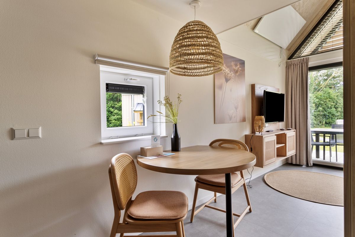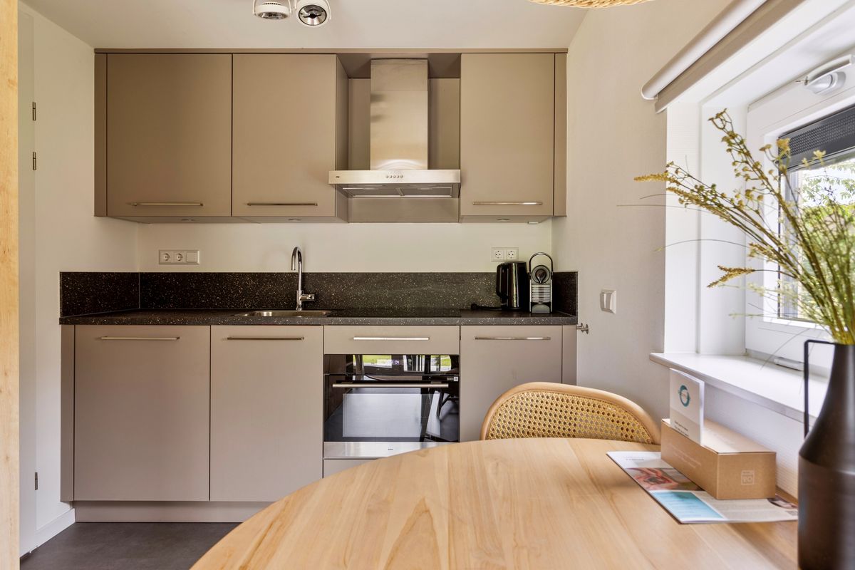 In dit charmante tiny house ervaar je direct een gevoel van licht, ruimte en rust. De open leefruimte is slim ingedeeld en combineert een moderne keuken met een gezellige zithoek, waar grote ramen zorgen voor een overvloed aan daglicht en een prachtig uitzicht op het terras. De keuken is voorzien van alles wat je nodig hebt om comfortabel te koken, van een kookplaat en combimagnetron tot een stijlvolle afwerking die past bij de eigentijdse uitstraling van de woning.