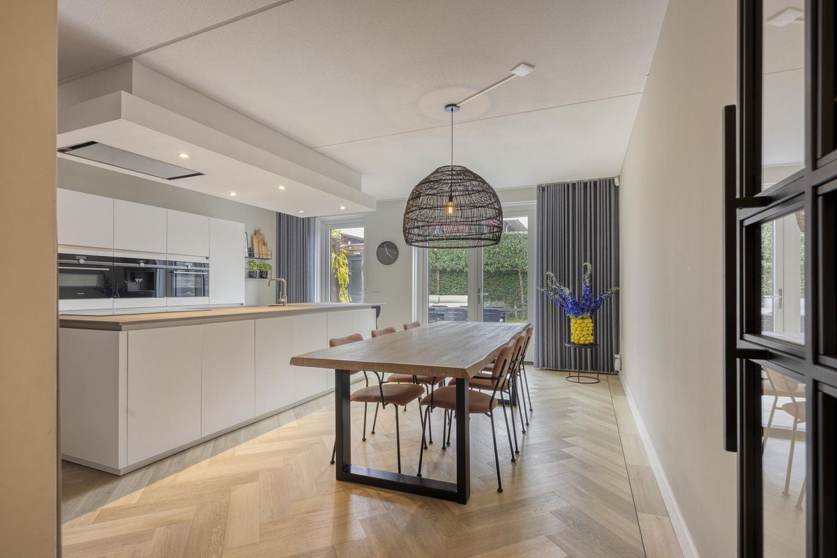 Dankzij de royale indeling is er ruimte genoeg voor een grote eettafel waar het hele gezin samen kan ontbijten, knutselen of uitgebreid tafelen met familie en vrienden. Via de loopdeur of de dubbele openslaande deuren sta je direct in de zonnige tuin — ideaal voor kinderen die naar buiten rennen of voor lange zomeravonden met vrienden aan tafel.