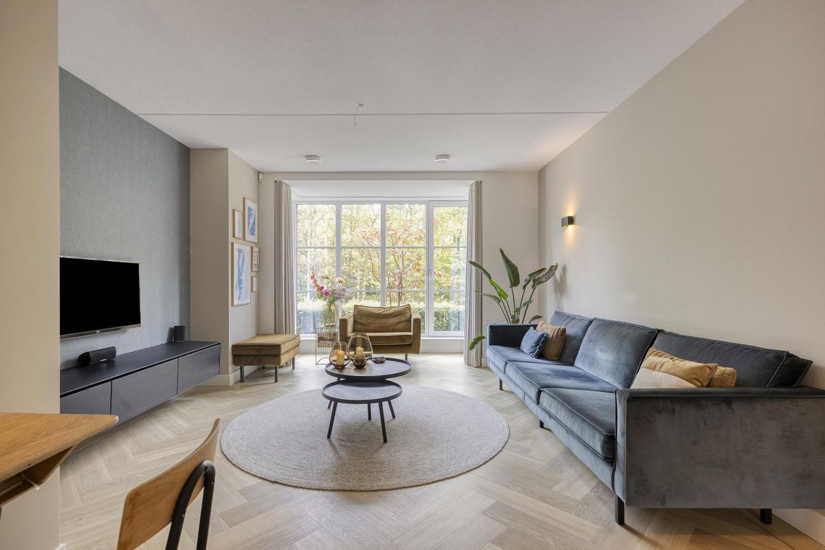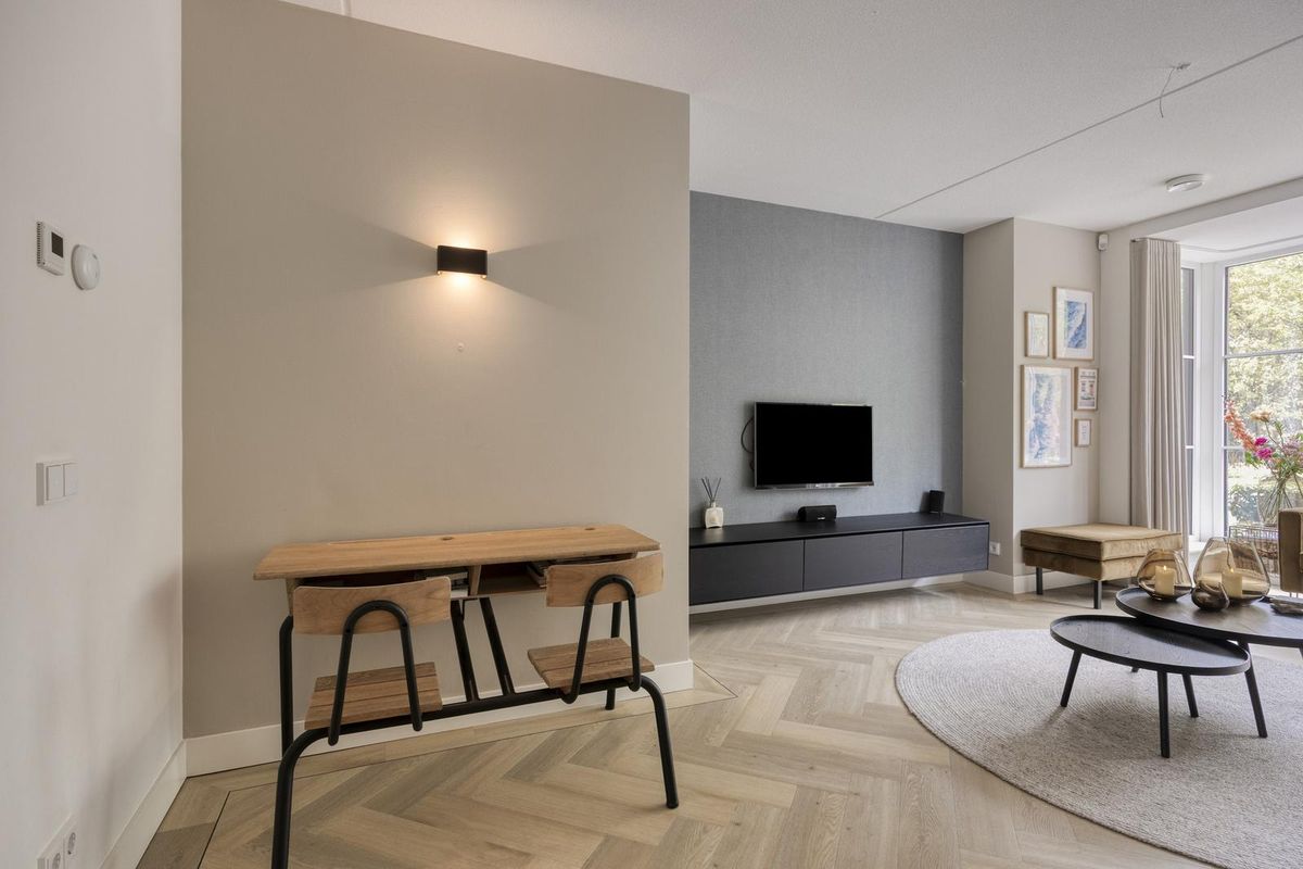 De woonkamer aan de voorzijde is minstens zo fijn. Door de brede erker valt er heerlijk veel daglicht binnen en voelt de ruimte nog groter aan dan hij al is. Met zijn 26 m² kun je hier alle kanten op: een grote hoekbank, een tv-meubel én nog genoeg ruimte voor een speelhoek of leesstoel. De sfeer is warm en gezellig, en dankzij de strakke afwerking hoef je hier niets meer te doen. Onder de trap is een vaste kast weggewerkt, ideaal voor speelgoed, gezelschapsspellen of de stofzuiger — alles binnen handbereik, maar uit het zicht.