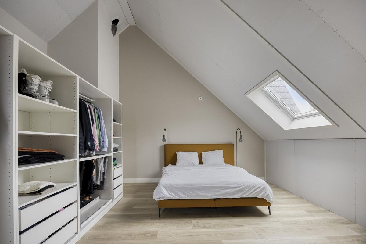 Op dit moment is de zolder ingericht als slaapkamer, maar de mogelijkheden zijn eindeloos. Je kunt hier eenvoudig een extra (slaap)kamer met voorzolder maken, of er juist een speelruimte of werkkamer van maken. Door de hoogte en het vele licht is dit een heerlijke verdieping om te verblijven. De vaste kast biedt extra bergruimte voor bijvoorbeeld koffers, kleding of speelgoed — superpraktisch in het dagelijks gebruik.