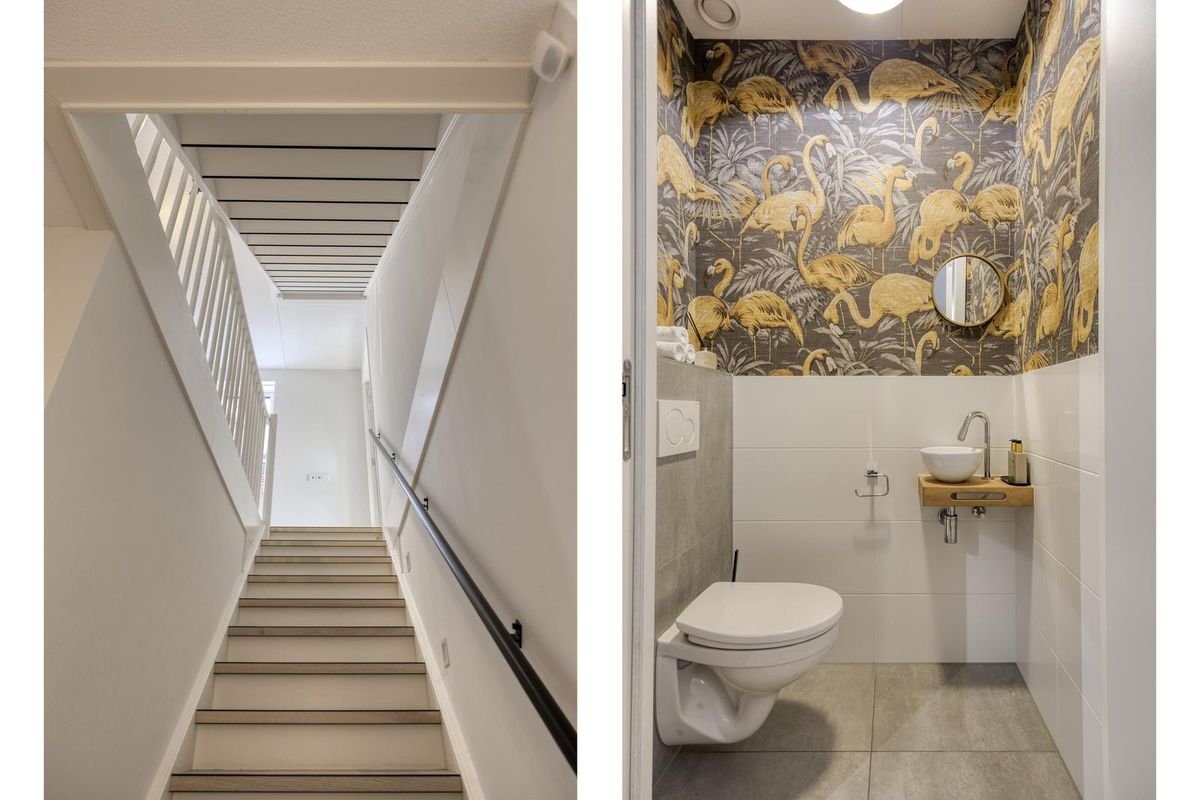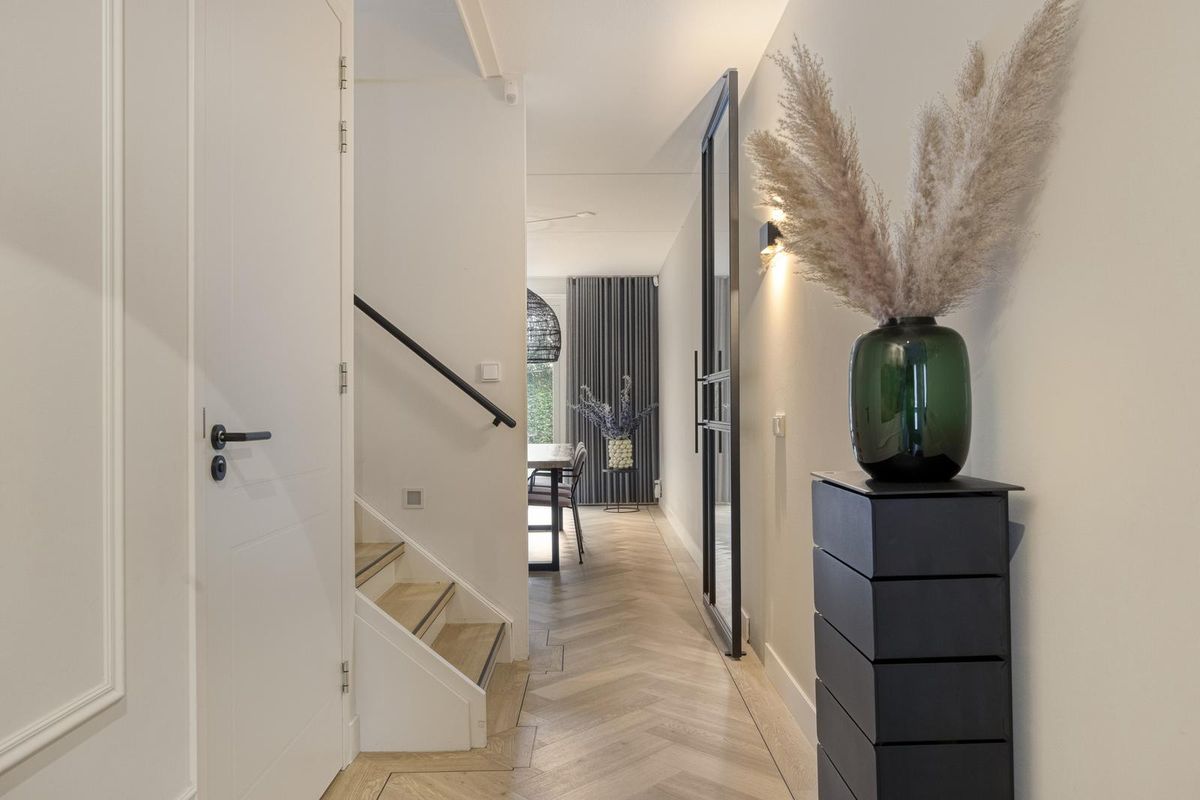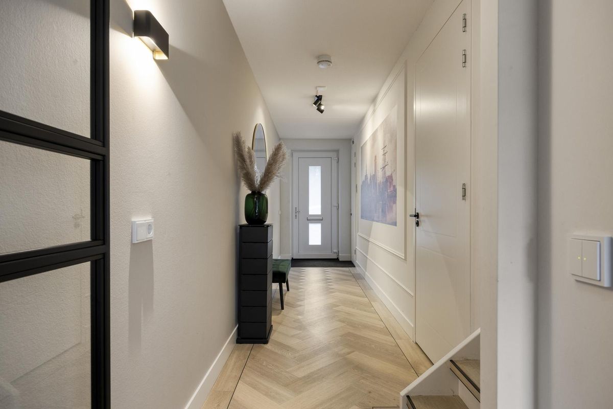 Via de verzorgde voortuin kom je binnen in een ruime hal met een luxe afwerking die meteen de toon zet voor de rest van het huis. Hier vind je de meterkast, het moderne toilet en de trapopgang naar boven. De pvc-vloer in visgraatmotief met hoge witte plinten loopt overal mooi door en zorgt voor een rustige, warme basis.