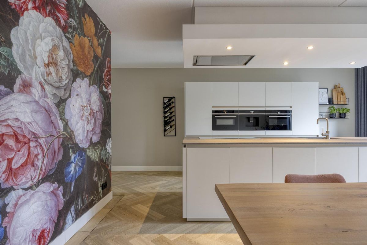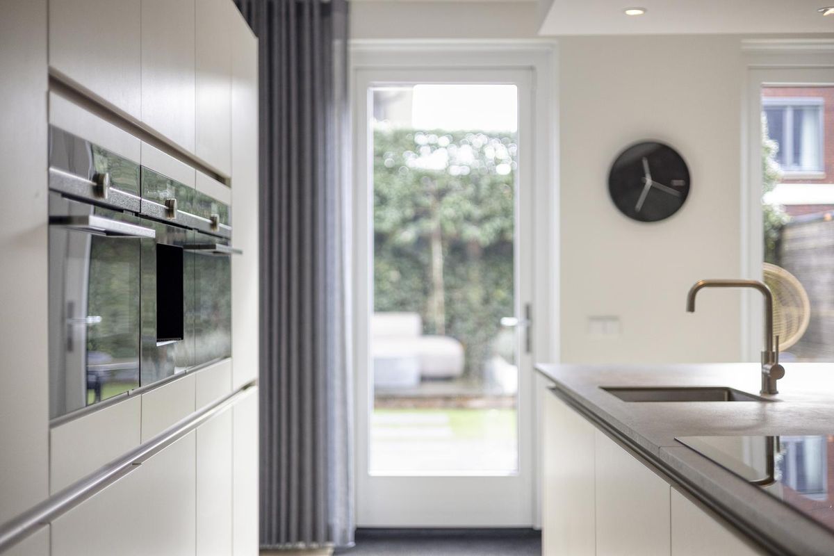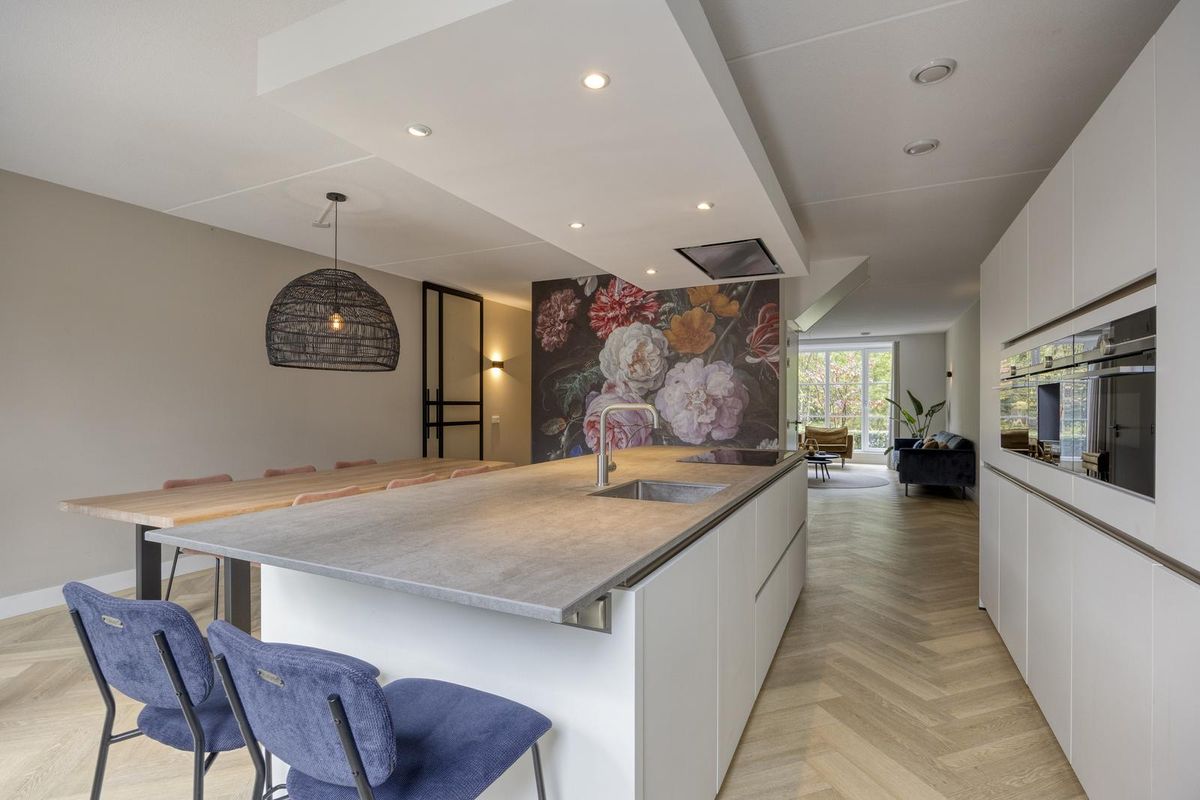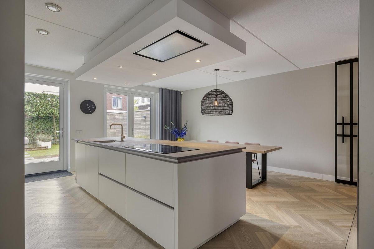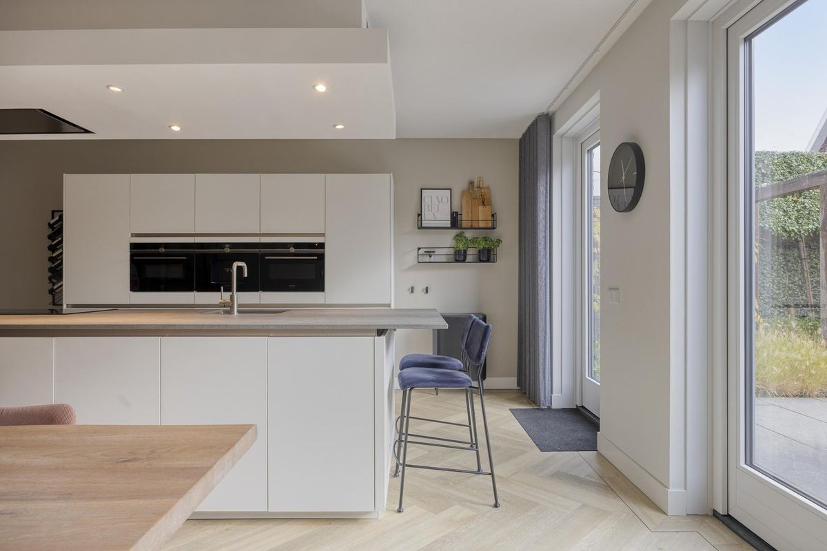 Vanuit de hal stap je de leefkeuken in — het echte hart van dit gezinshuis. De ruimte is met zijn 5,75 meter breedte en 5,97 meter diepte royaal van formaat en stijlvol ingericht. Hier kook, eet en leef je samen. Het grote kookeiland is een plek waar iedereen automatisch samenkomt: kinderen die hier hun huiswerk doen terwijl jij kookt, of vrienden die gezellig aanschuiven met een glas wijn. De keuken is luxe uitgevoerd met een brede Siemens-inductiekookplaat met eilandafzuigkap, een spoelbak met kraan, een vaatwasser en volop bergruimte in lades en kasten. De hoge kastenwand herbergt een koelkast, diepvries, koffiezetapparaat, combi-stoomoven en combi-oven. Alles is tot in detail afgewerkt en perfect doordacht.