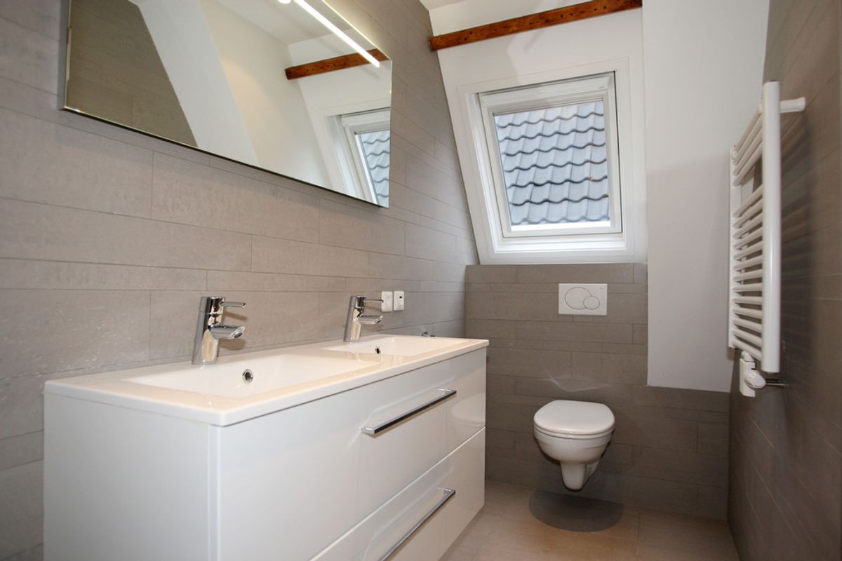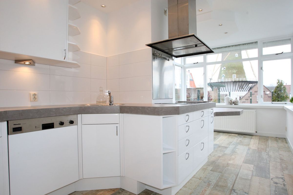Hallway, toilet, living room with a fireplace and a small balcony at the front. At the rear of the living room, French doors lead to the spacious roof terrace with a view of the windmill. The roof terrace offers plenty of privacy and is equipped with sunshades (facing southwest). The kitchen/diner is fully equipped and has a dining table attached to the kitchen.