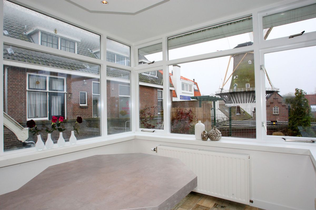 Hal, toilet, woonkamer met openhaard en aan de voorzijde een klein balkonnetje en aan de achterzijde van de woonkamer bereikt u door middel van openslaande deuren het riante dakterras met uitzicht op de molen. Het dakterras biedt zeer veel privacy en is voorzien van zonnewering (gelegen op het ZuidWesten), de woonkeuken is van alle gemakken voorzien en heeft een eettafel die aan de keuken vast zit.