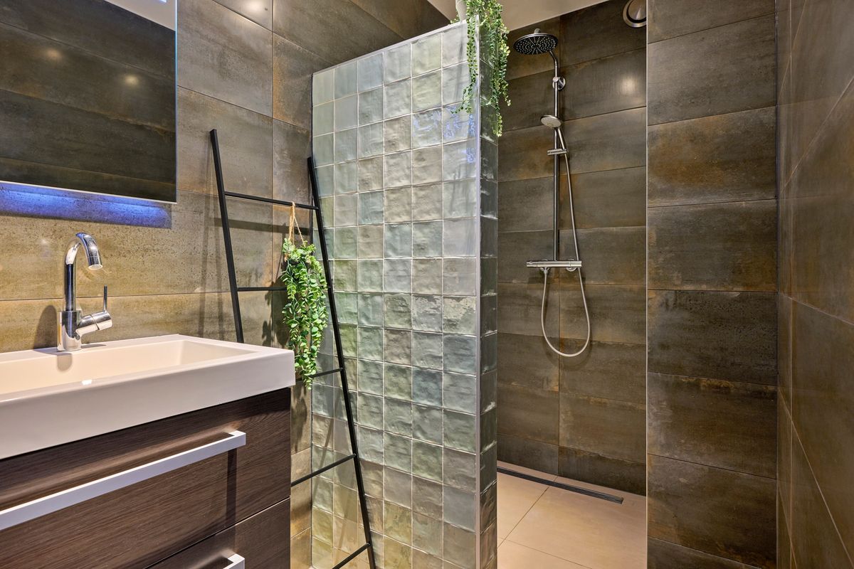 Een brede trap leidt naar de woonverdieping, eveneens voorzien van lamelparket. Aan de voorzijde bevinden zich twee ruime slaapkamers met gevelbrede ramen en een koele ligging in de zomer. De grootste kamer beschikt over een walk-in closet. Vanuit de hal zijn de aparte wasruimte, het toilet en de moderne badkamer bereikbaar. De badkamer heeft een inloopdouche, dubbele wastafel, handdoekradiator, dimverlichting en een verwarmde spiegel – alles in wellness