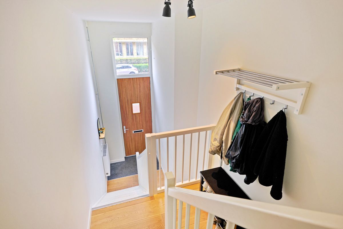 Via de entree op de begane grond betreed je het appartement, direct opvallend door het bijna vier meter hoge plafond. Onder de trap is slim gebruikgemaakt van de ruimte met een afgesloten berging en een nis voor kinderwagen of fietsen. Halverwege bevindt zich extra bergruimte in een trapkast met garderobe. De entree is afgewerkt met een lamelparketvloer.