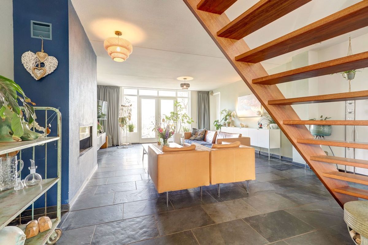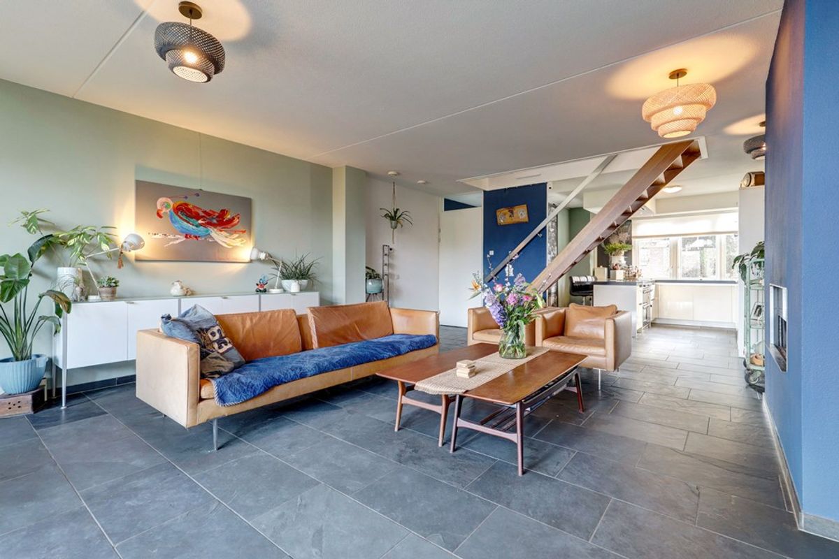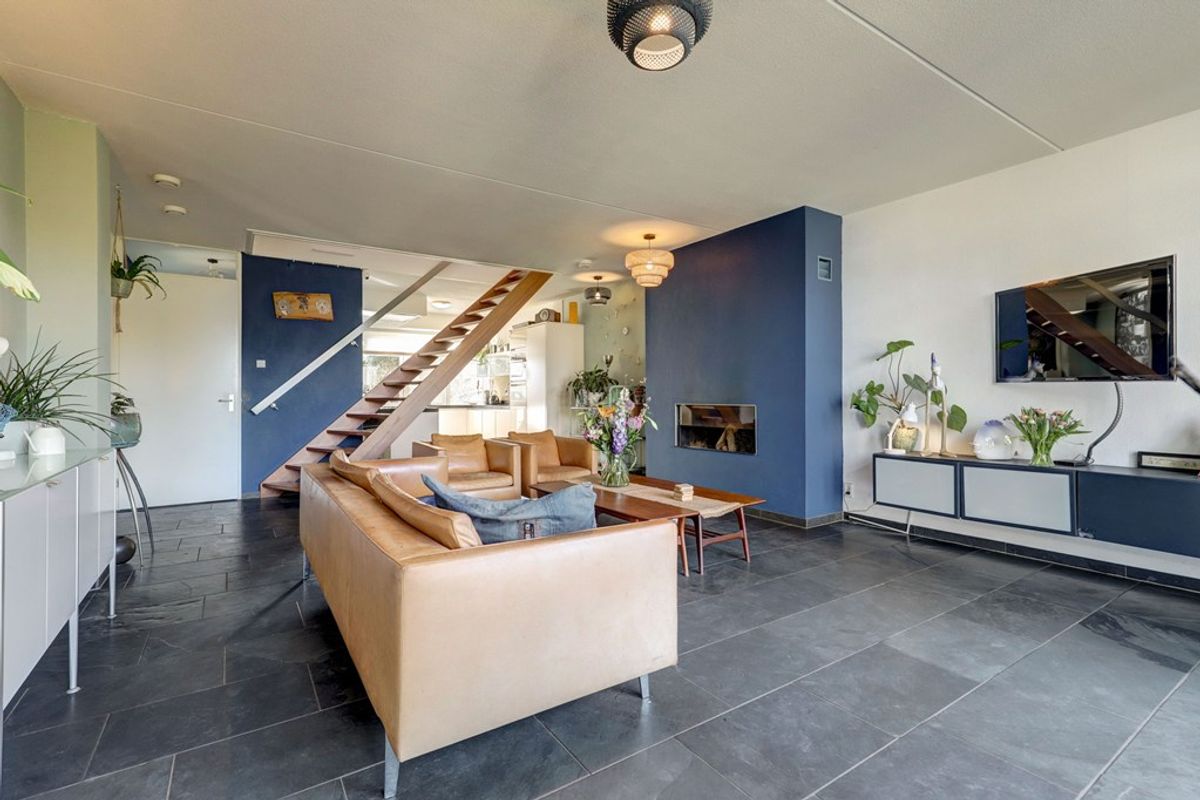 Via de entree kom je in de hal met meterkast, toilet en toegang tot de woonkamer. De ruime, tuingerichte woonkamer (ca. 44 m²) is licht en open, met grote raampartijen en een prettige verbinding met de keuken. De houtkachel zorgt voor extra sfeer.