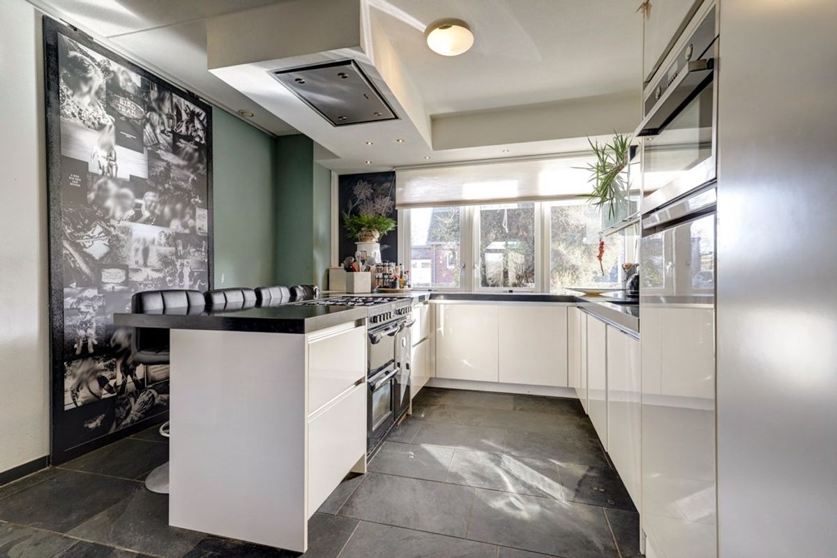 De open keuken aan de voorzijde is voorzien van diverse inbouwapparatuur, waaronder een gasfornuis met oven, afzuigkap, combimagnetron, koelkast en vaatwasser.