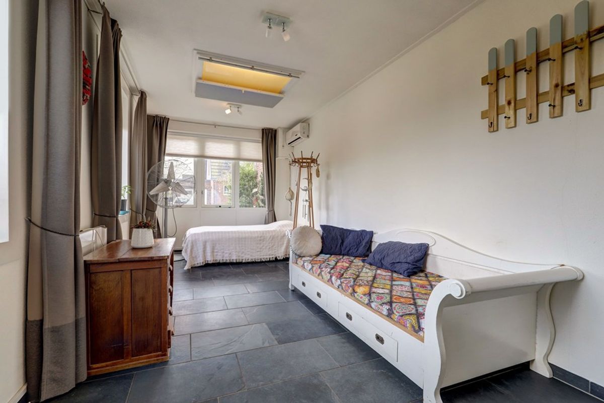 Een groot pluspunt is de levensloopbestendige indeling. Aan de rechterzijde is de woning uitgebouwd, waardoor er extra leefruimte is ontstaan. In deze aanbouw, met eigen ingang, bevindt zich een ruime slaapkamer met airconditioning en een keukenblokje, evenals een aparte badkamer met wastafel, douche, toilet en wasmachineaansluiting. Deze ruimte is multifunctioneel inzetbaar, bijvoorbeeld als werkruimte, mantelzorgunit, praktijk aan huis of speelkamer.