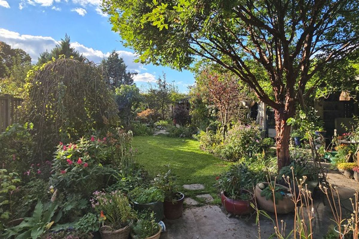 De diepe achtertuin (circa 29 meter diep en 13 meter breed) ligt op het zuidwesten en biedt volop zon, privacy en gebruiksmogelijkheden. De tuin is op natuurlijke wijze aangelegd met voornamelijk biologische beplanting, wat zorgt voor een levendige omgeving voor vogels, bijen en andere insecten. Met een tuinhuis, berging, overkapping en meerdere terrassen is er ruimte genoeg om te tuinieren, ontspannen, spelen of gewoon te genieten van het buitenleven.